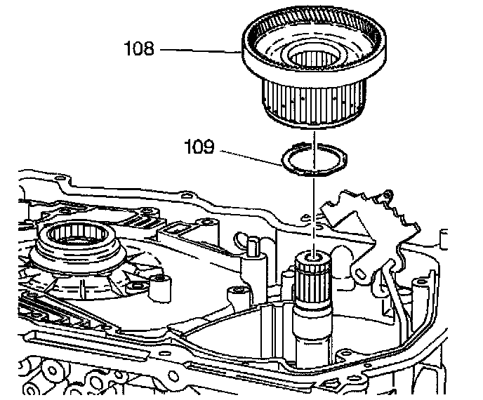 2. If the forward clutch hub to race thrust washer (109) did not remain with the forward clutch hub, remove the forward clutch hub to race thrust washer (109).
