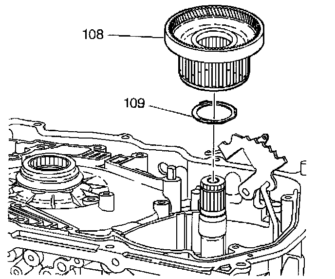 Important: Install the forward clutch hub and input internal gear assembly into the transmission case. Rotate the assembly while installing in order to spline the forward clutch hub (108) to the forward clutch plates (602).