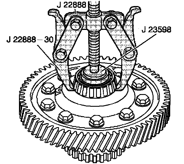 1. Remove the left differential side bearing using the J 22888, the J 22888-30 and the J 23598/J 2241-11.