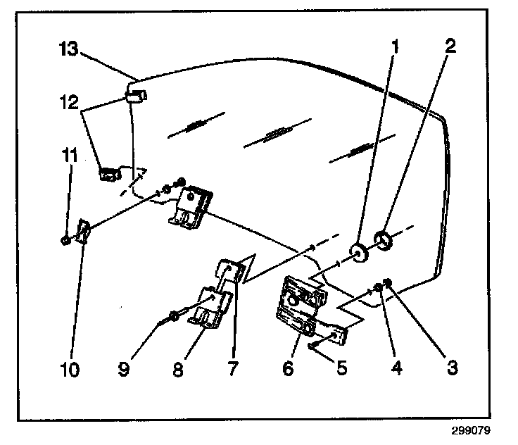 1. Install the window regulator assembly (1) through the door inner panel access hole.