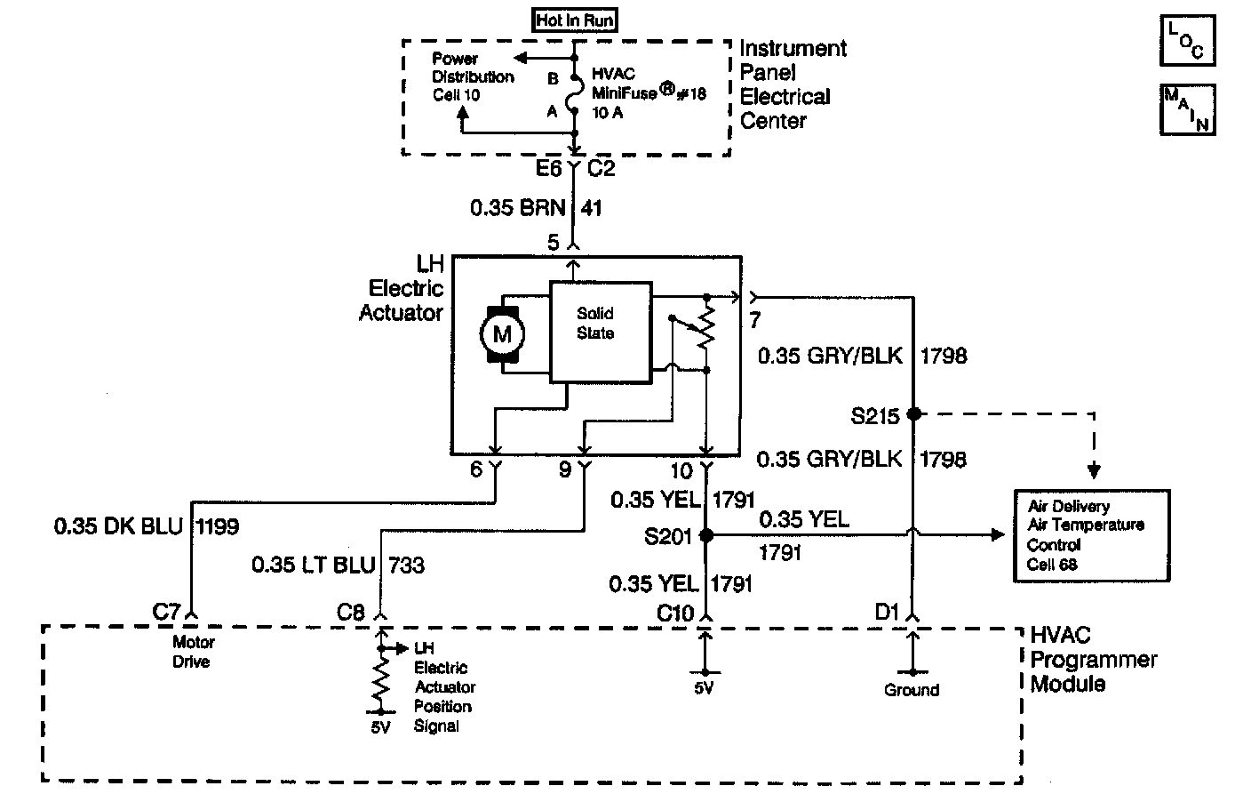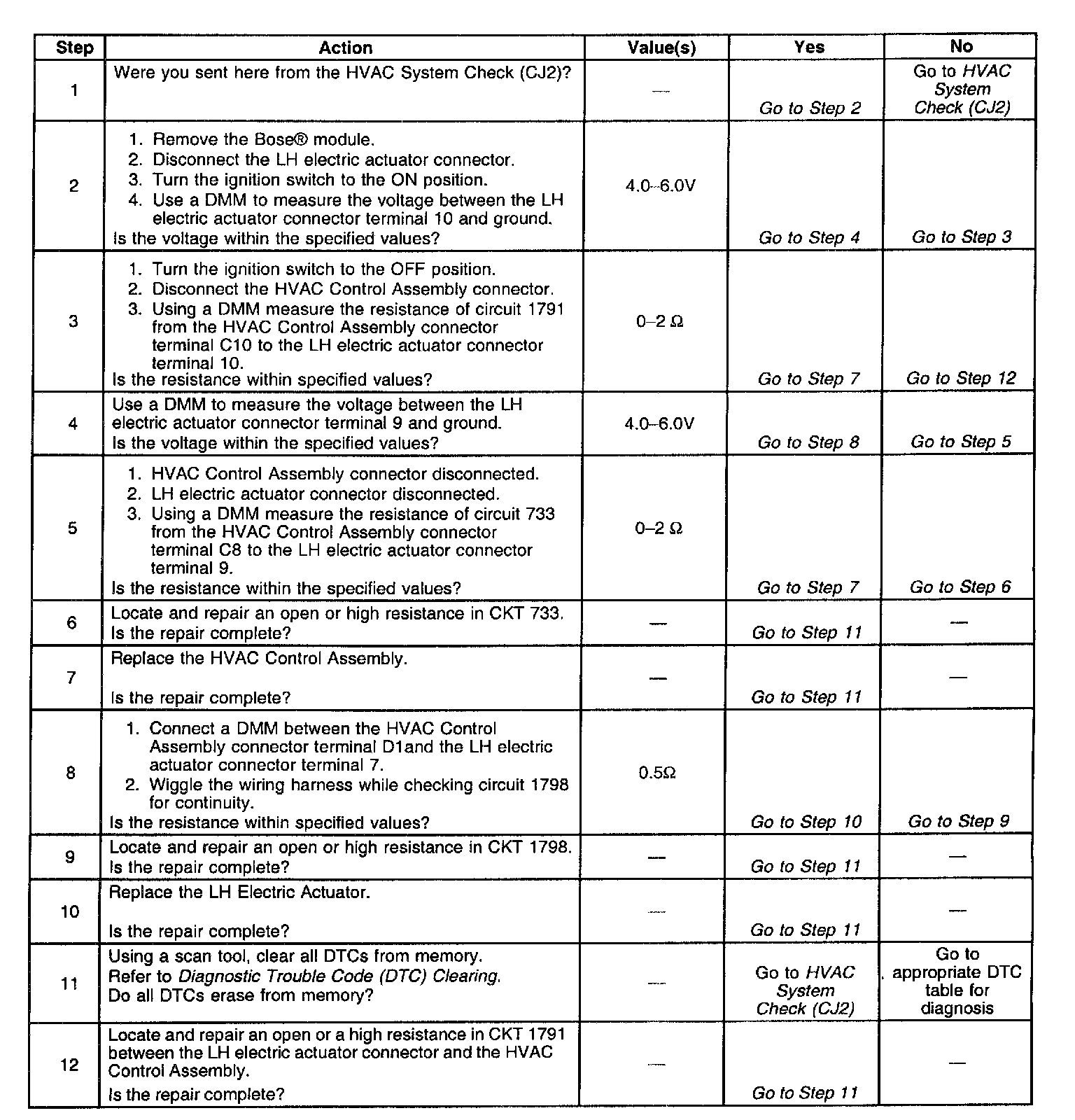 The HVAC Control Assembly receives a LH electric actuator position signal from the LH electric actuator. The LH electric actuator position sensor is a potentiometer that is tied to a 5 volt reference source through CKT 1791 and to ground through CKT 1798, both from the HVAC Control Assembly. The variable output from the potentiometer feeds back a position signal through CKT 733 to a pull-up resistor located in the HVAC Control Assembly. This signal is used to determine the necessary drive signal to the LH electric actuator motor to provide the proper air mix door position. This value is stored in the Keep Alive Memory (KAM) portion of the HVAC Control Assembly.