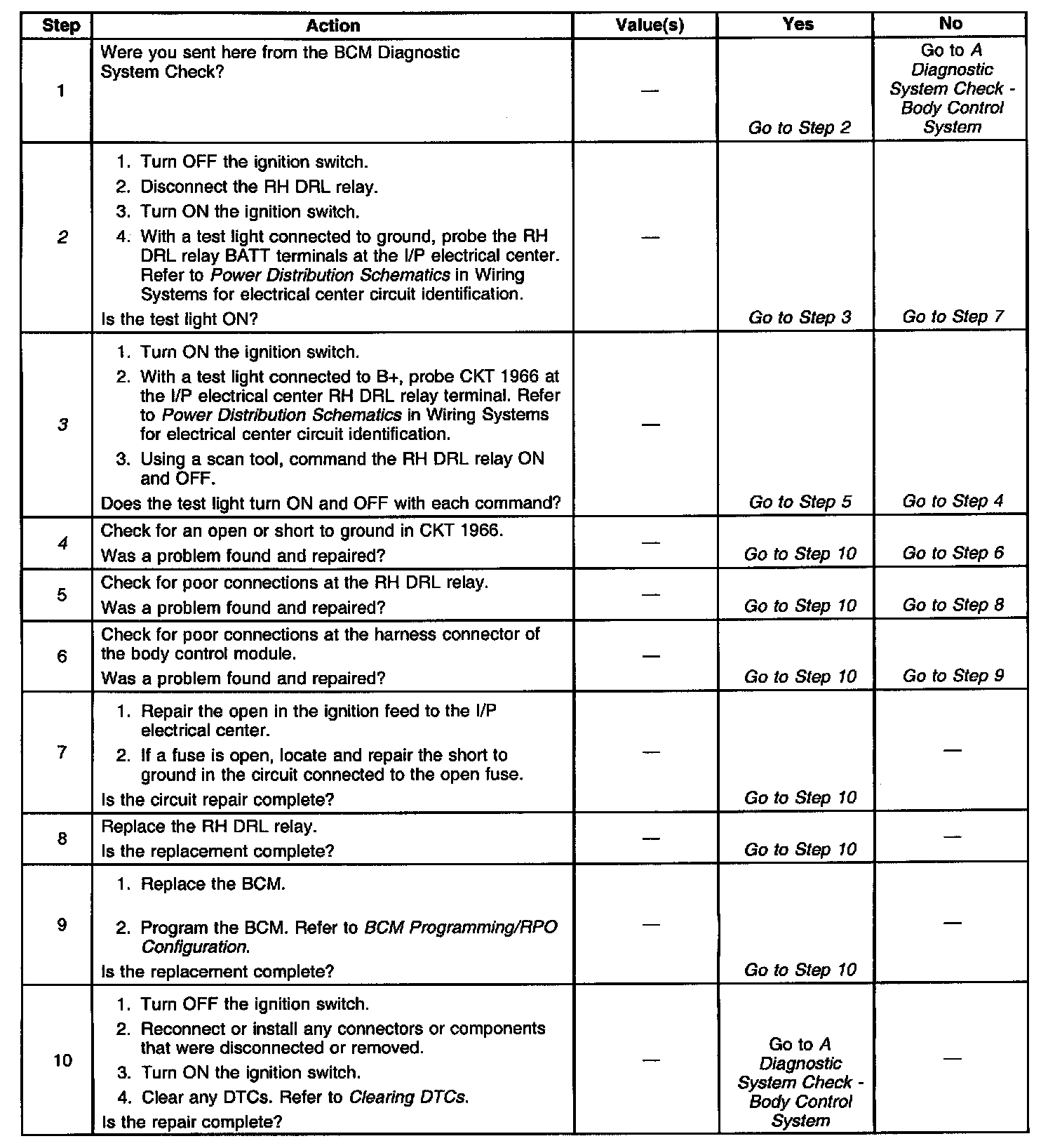 ^ The BCM no longer detects a low voltage level in CKT 1966 only with the RH DRL relay de-energized.