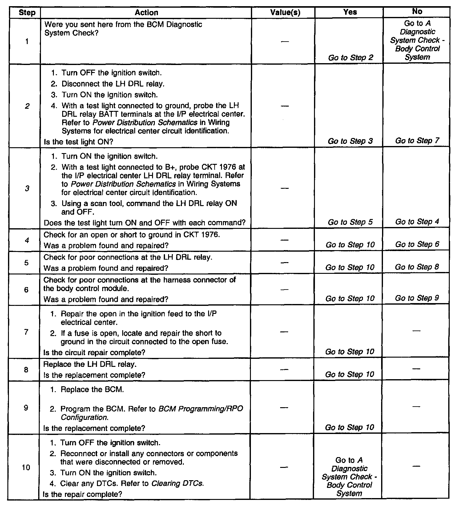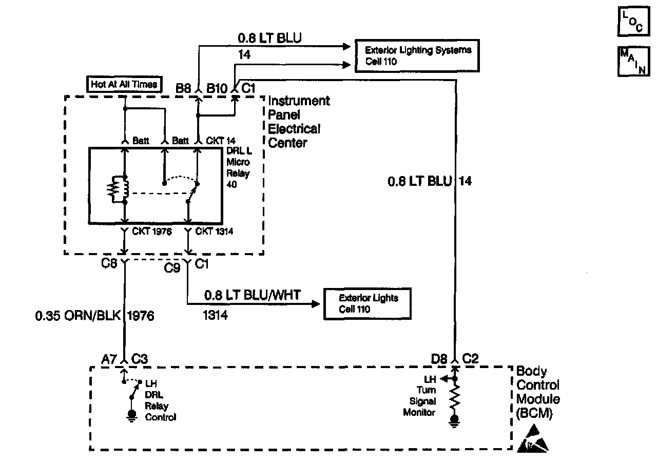 The BCM provides control for the LH DRL relay circuit. The BCM grounds CKT 1976 in order to energize the LH DRL relay and turn ON the LF turn signal This allows the LF turn signal to be used for DRL, UTD, and approach lighting functions. The BCM monitors the voltage level on CKT 1976. When the BCM commands the relay ON, the voltage level on CKT 1976 should be low. When the relay is OFF, the voltage on CKT 1976 should be high. If the BCM detects a voltage level other than expected, a malfunction is present and a DTC will set.