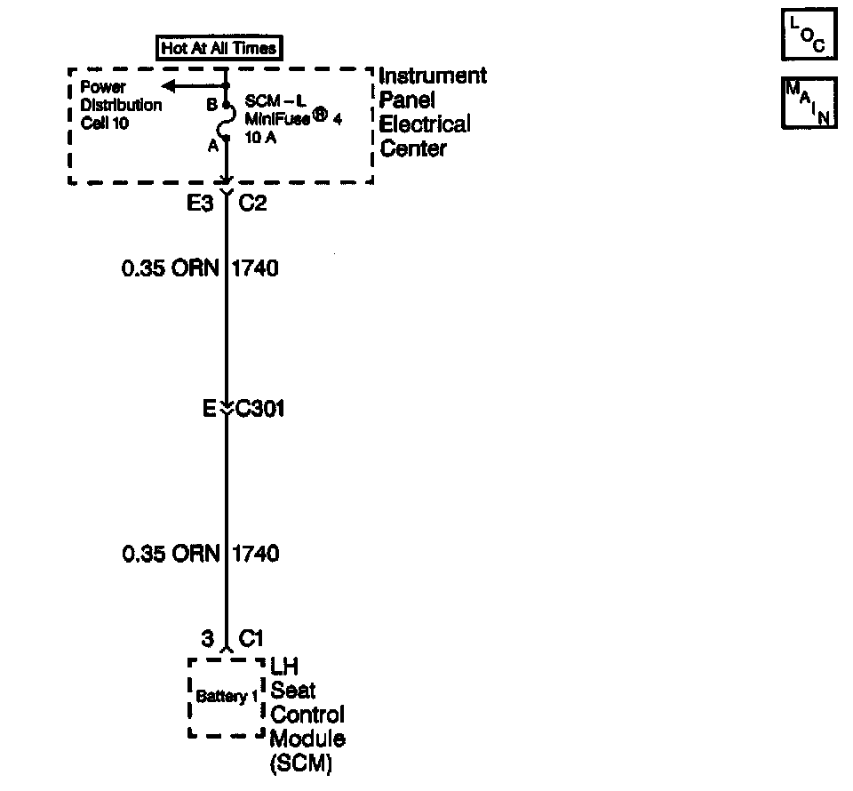 The LH Seat Control Module (SCM) has two main power feeds (high and low), and one main ground. The low power feed (battery 1) is used to provide power for the SCM logic and internal driver operation. The high power feed (battery 2) is used to provide power for systems that draw higher amounts of current (motors, lights etc.). For most functions, the SCM will operate properly when vehicle system voltage is between 9.0-16.0 volts. The SCM also monitors the voltage level at battery 1 and battery 2 circuits and can determine if the voltage level received is out of range. It the voltage level is out of range in either circuit, then a malfunction is present and a DTC will set.