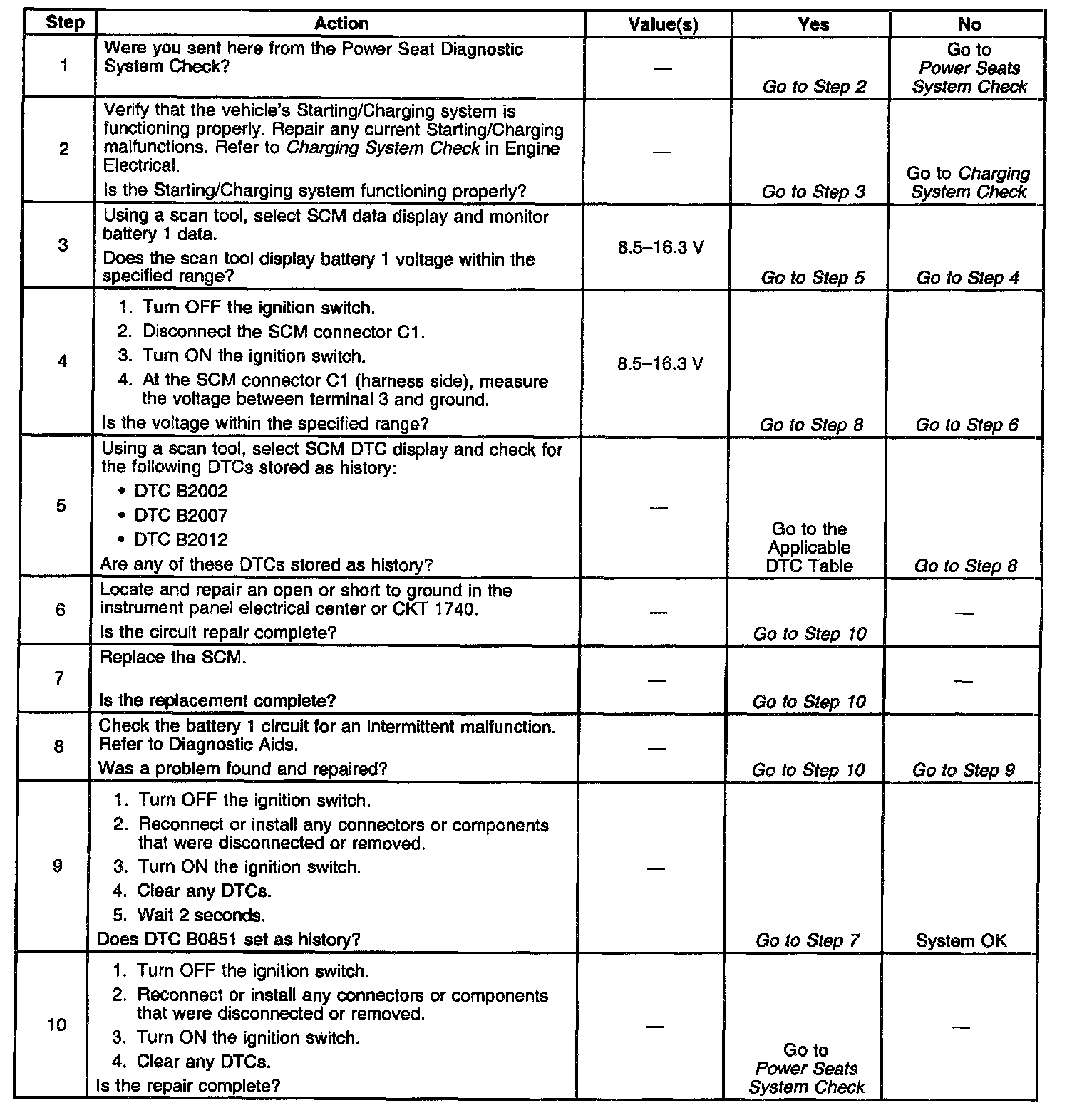 ^ Using a scan tool, select SCM Data display and monitor battery 1 voltage while operating the seat adjuster motors. This can determine if battery 1 voltage is affected by these devices and can help duplicate the malfunction.