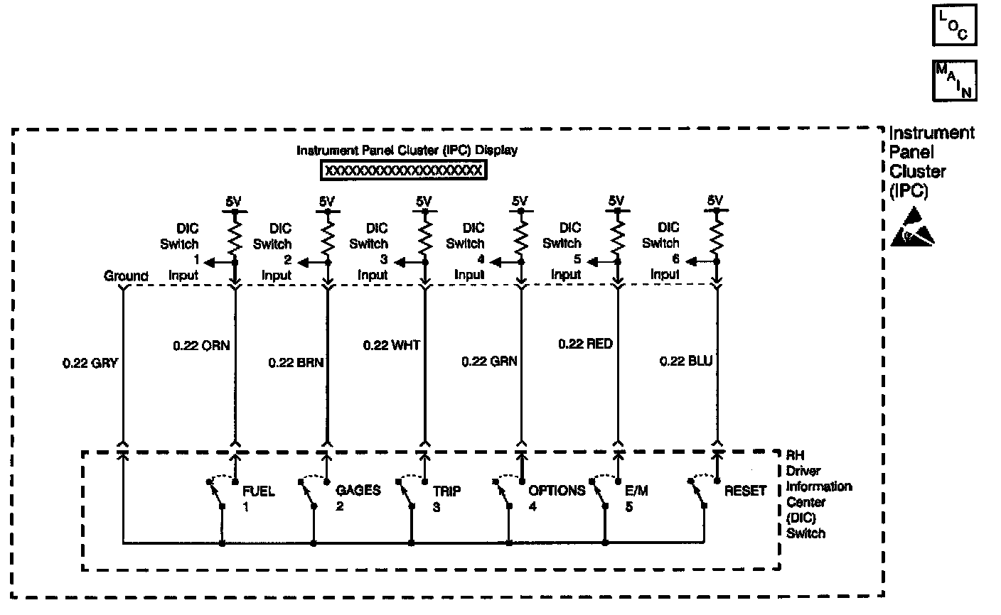 The Driver Information Center (DIC) contains six switch circuits that allow Instrument Panel Cluster (IPC) functions to be perform. The IPC supplies a 5 volt reference voltage to each switch circuit. When a DIC switch is pressed, the circuit is pulled low by grounding that circuit through the DIC switch altering the voltage level. The IPC detects which DIC switch is pressed by monitoring the voltage level on each DIC switch circuit. The IPC also monitors the DIC switch circuits and determines how long the voltage level has changed. If the voltage level detected is low for longer than expected, then a malfunction is present and a DTC will set.