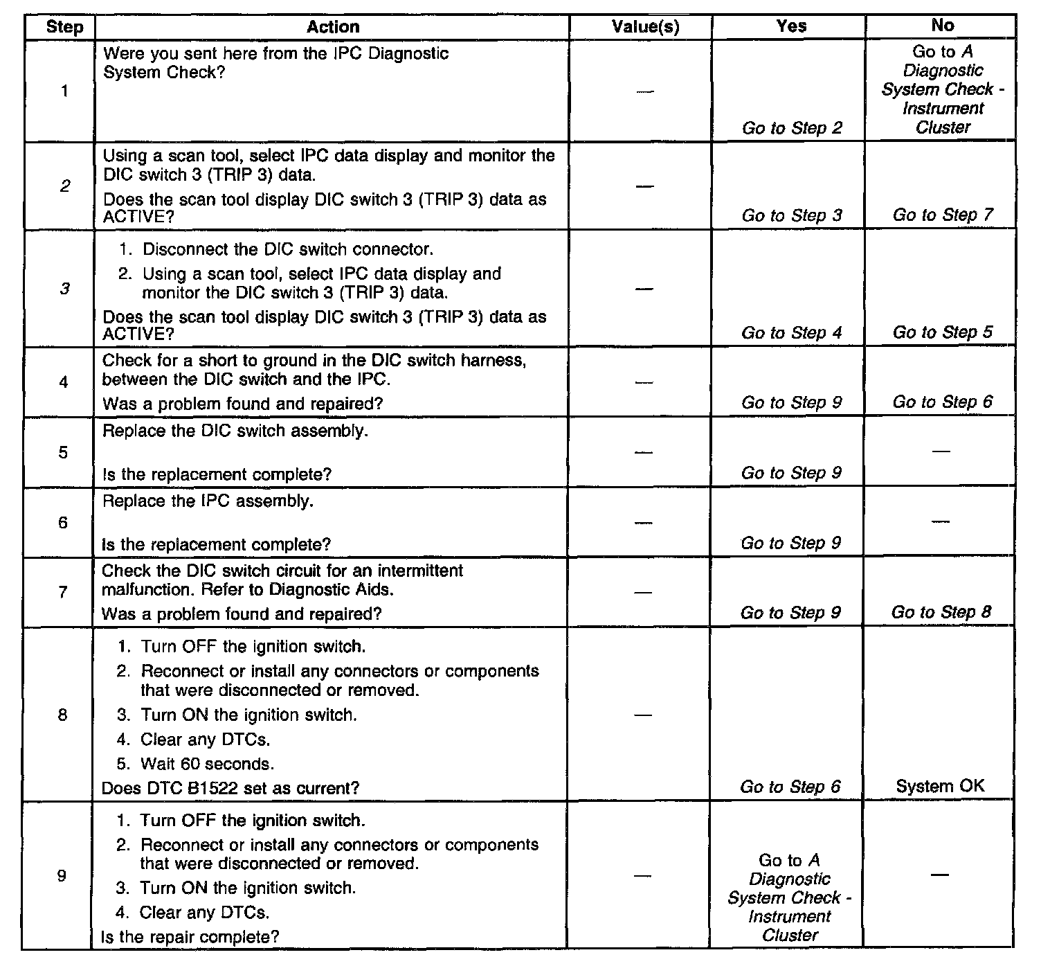 ^ If a DIC switch 3 (TRIP 3) is pressed for longer than 60 seconds, a DTC B1522 may set with no malfunctions present. Always verify that this condition did not occur before diagnosing a DTC B1522.