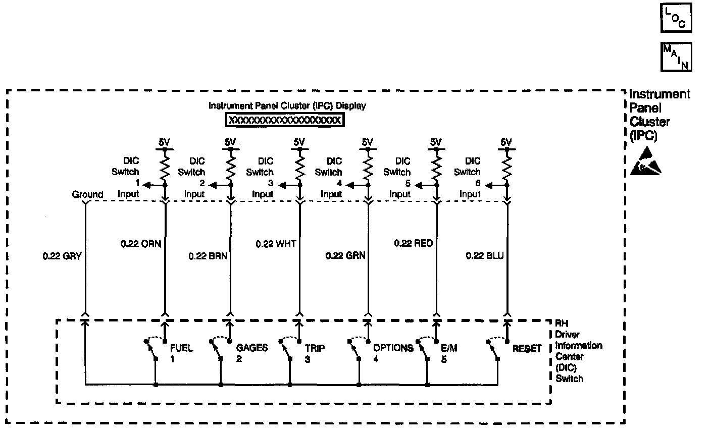 The Driver Information Center (DIC) contains six switch circuits that allow Instrument Panel Cluster (IPC) tunctions to be perform. The IPC supplies a 5 volt reference voltage to each switch circuit. When a DIC switch is pressed, the circuit is pulled low by grounding that circuit through the DIC switch altering the voltage level. The IPC detects which DIC switch is pressed by monitoring the voltage level on each DIC switch circuit. The IPC also monitors the DIC switch circuits and determines how long the voltage level has changed. If the voltage level detected is low for longer than expected, then a malfunction is present and a DTC will set.