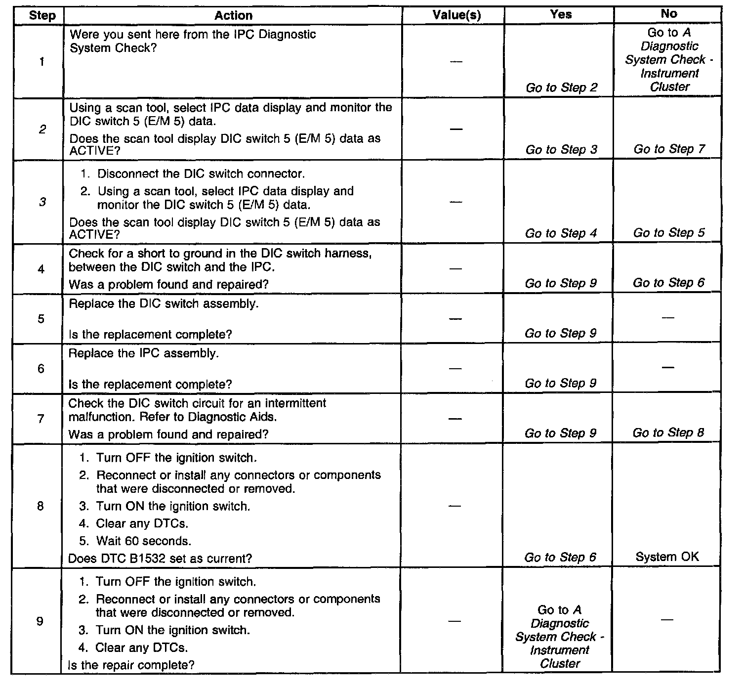 ^ If a DIC switch 5 (E/M 5) is pressed for longer than 60 seconds, a DTC Bi 532 may set with no malfunctions present. Always verify that this condition did not occur before diagnosing a DTC B1532.