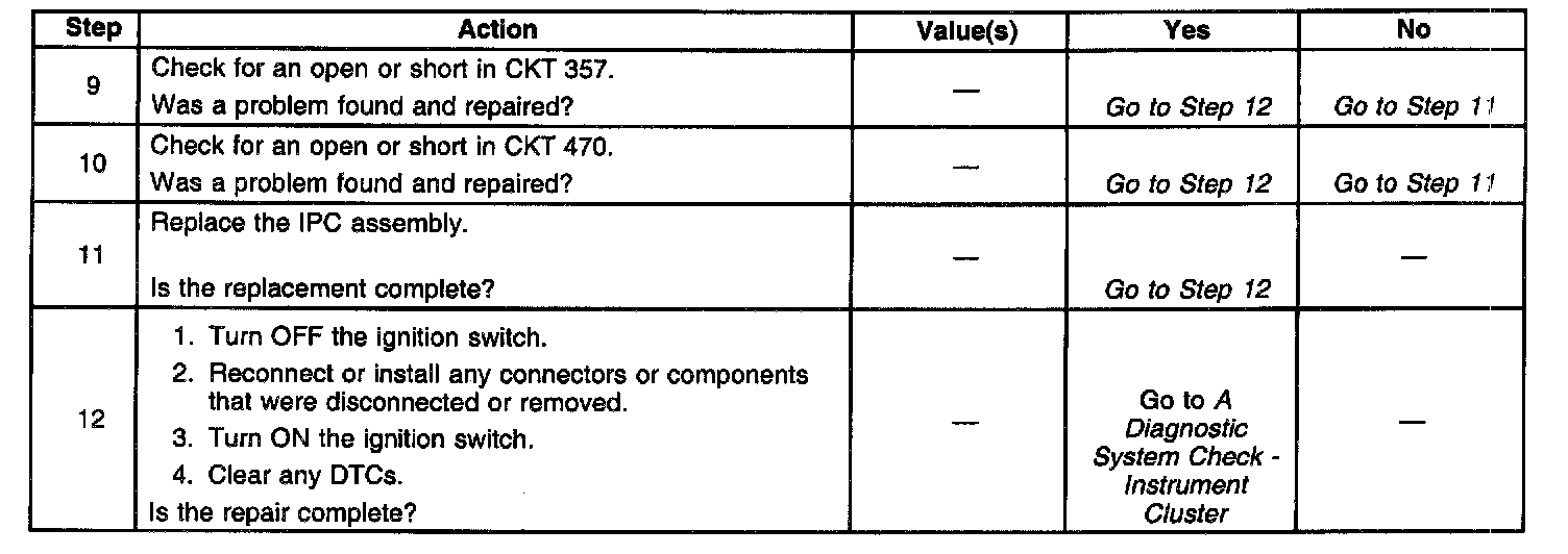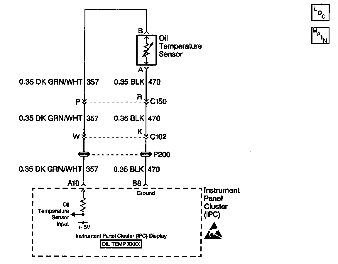 ^ Check if the IPC is able to recognize a change in resistance from the oil temperature sensor by grounding CKT 357. If the IPC displays oil temperature at approximately 392 °C (200 °F), then the IPC and CKT 357 is not the cause of the malfunction. Check for an open in the oil temperature sensor ground circuit or the sensor itself.