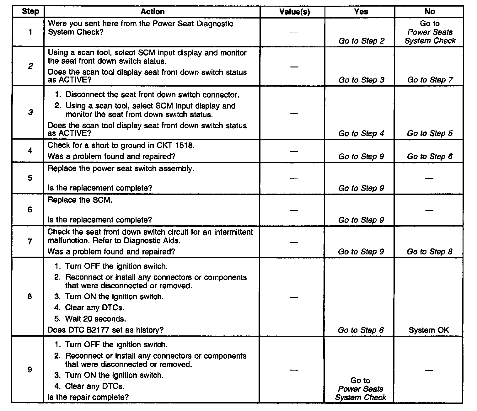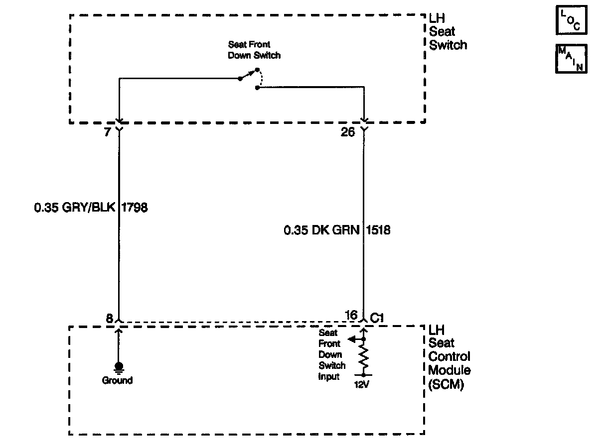 ^ Using a scan tool, select SCM inputs and monitor the seat front down switch status. If the scan tool displays ACTIVE, disconnect the seat front down switch and check if the seat status change's to INACTIVE. If the status changed, then replace the LH seat switch. If the status did not change, then check CKT 1518 for a short to ground.