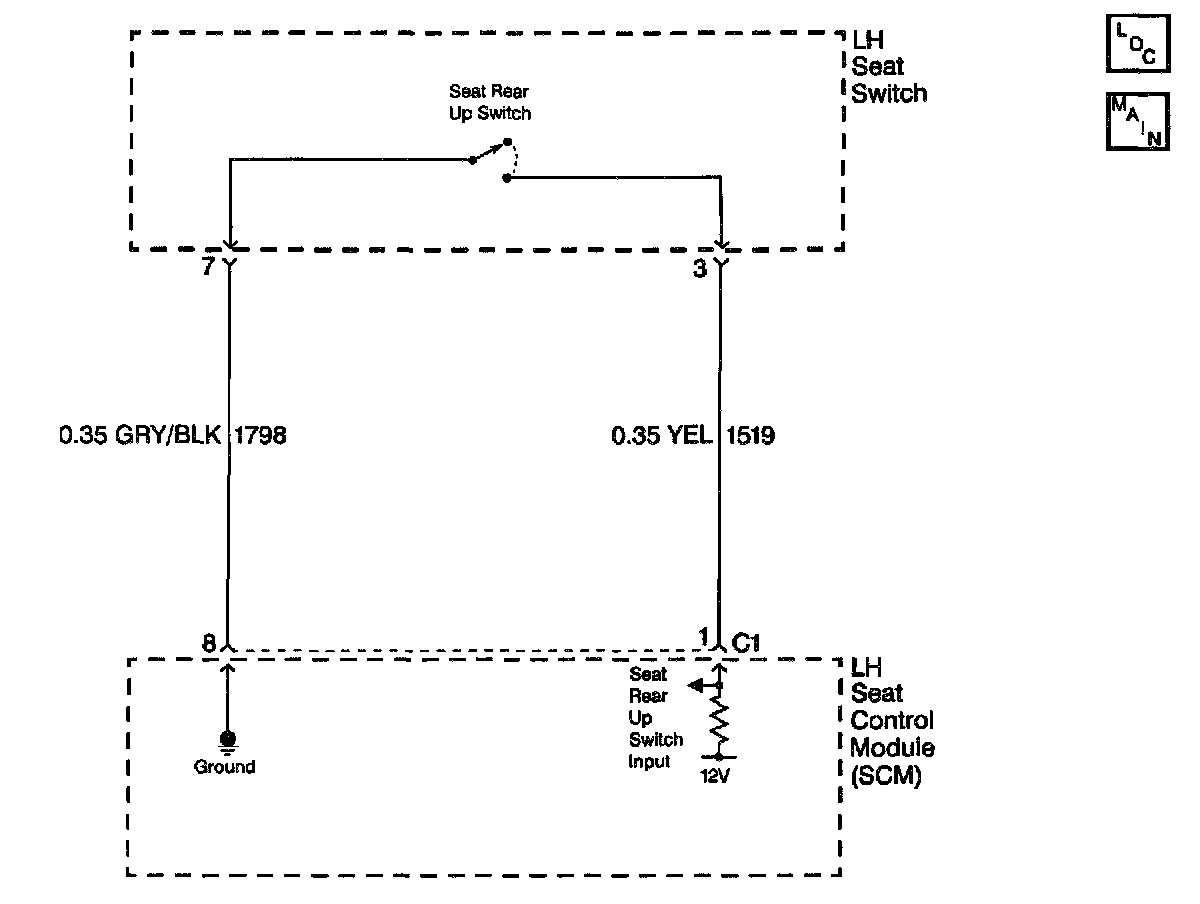 ^ Using a scan tool, select SCM inputs and monitor the seat rear up switch status. If the scan tool displays ACTIVE, disconnect the seat rear up switch and check if the seat status changes to INACTIVE. If the status changed, then replace the LH seat switch. If the status did not change, then check CKT 1519 for a short to ground.