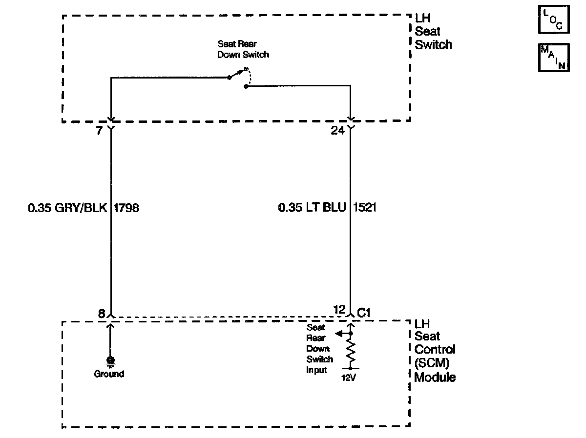 The LH seat switch circuit provides an input to the LH Seat Control Module (SCM) when the seat rear switch is pressed DOWN. This input allows the SCM to detect a seat rear DOWN request. The SCM provides a signal, which is pulled up to system battery voltage through a pull-up resistor, and a ground to the seat rear down switch. When the seat rear down switch is pressed the signal is pulled low within the SCM. When the SCM detects the transition from high to low it will command the seat rear to move in the DOWN direction. When the switch is released it will command the seat rear to stop.