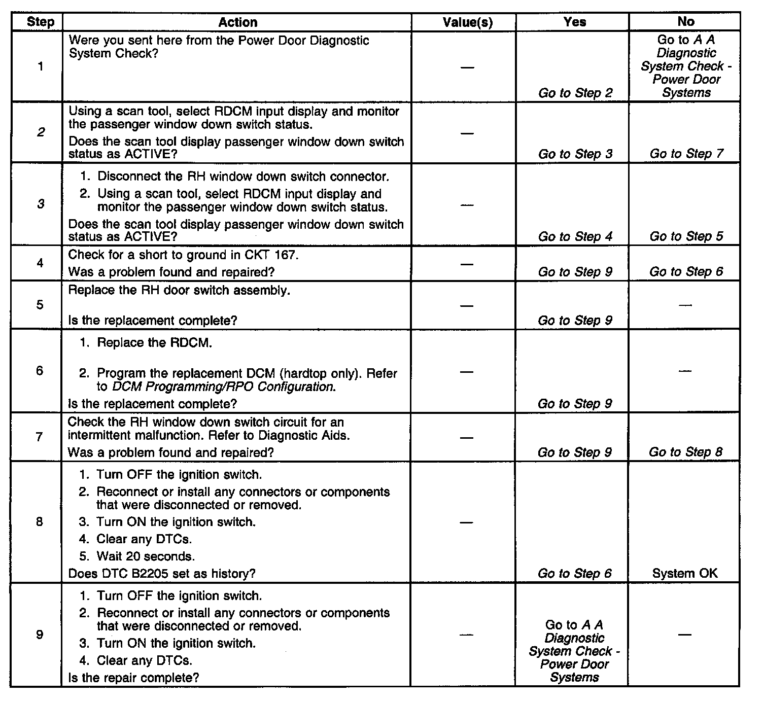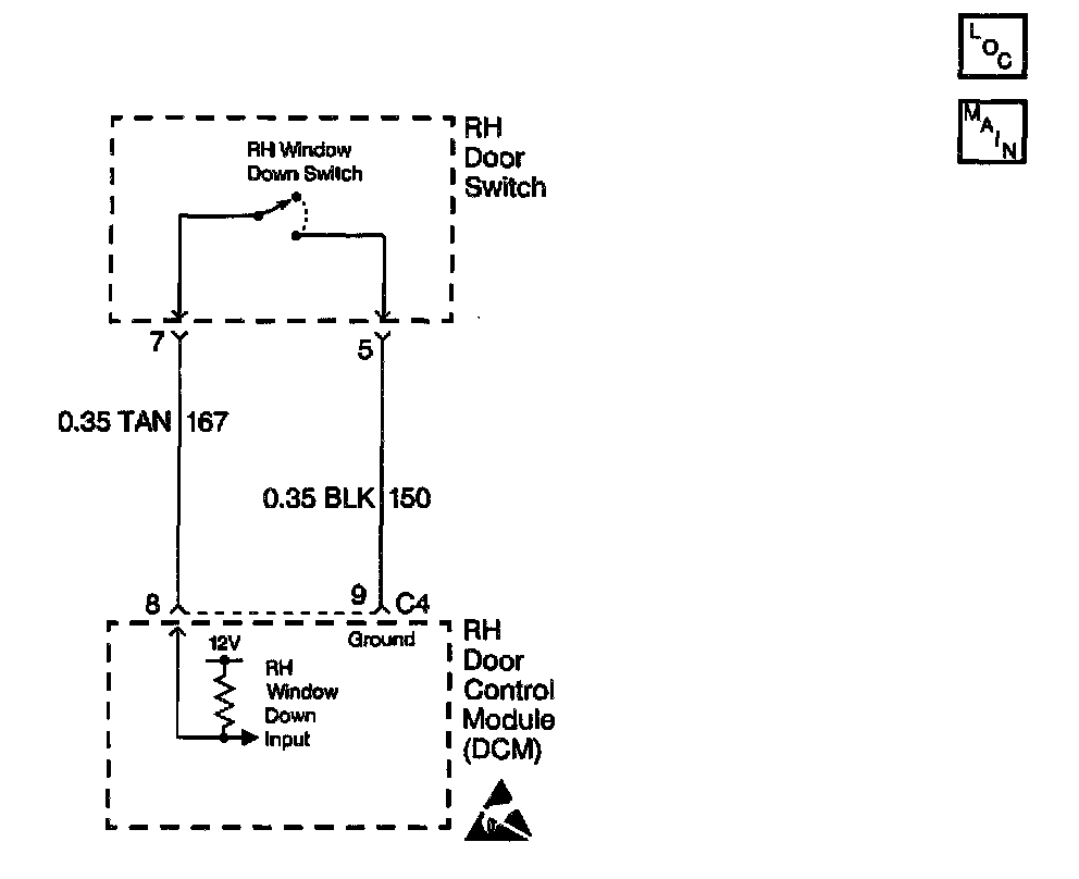 ^ Using a scan tool, select RDCM inputs and monitor the passenger window down switch status. If the scan tool displays ACTIVE, disconnect the RH window switch and check if the window status changes to INACTIVE. If the status changed, then replace the RH window switch. If the status did not change, then check CKT 167 for a short to ground.