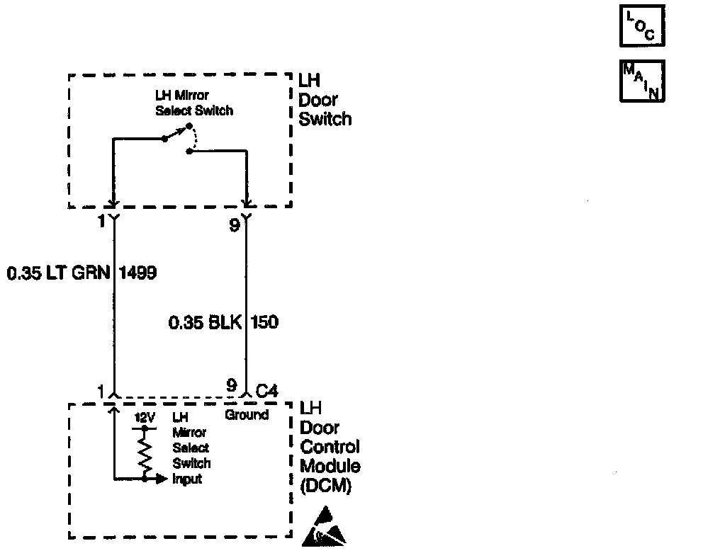 ^ Using a scan tool, select LDCM inputs and monitor the driver mirror select switch status. If the scan tool displays ACTIVE, disconnect the LH mirror switch and check if the driver mirror select switch status changes to INACTIVE. If the status changed, then replace the LH mirror switch. If the status did not change, then check CKT 1499 for a short to ground.