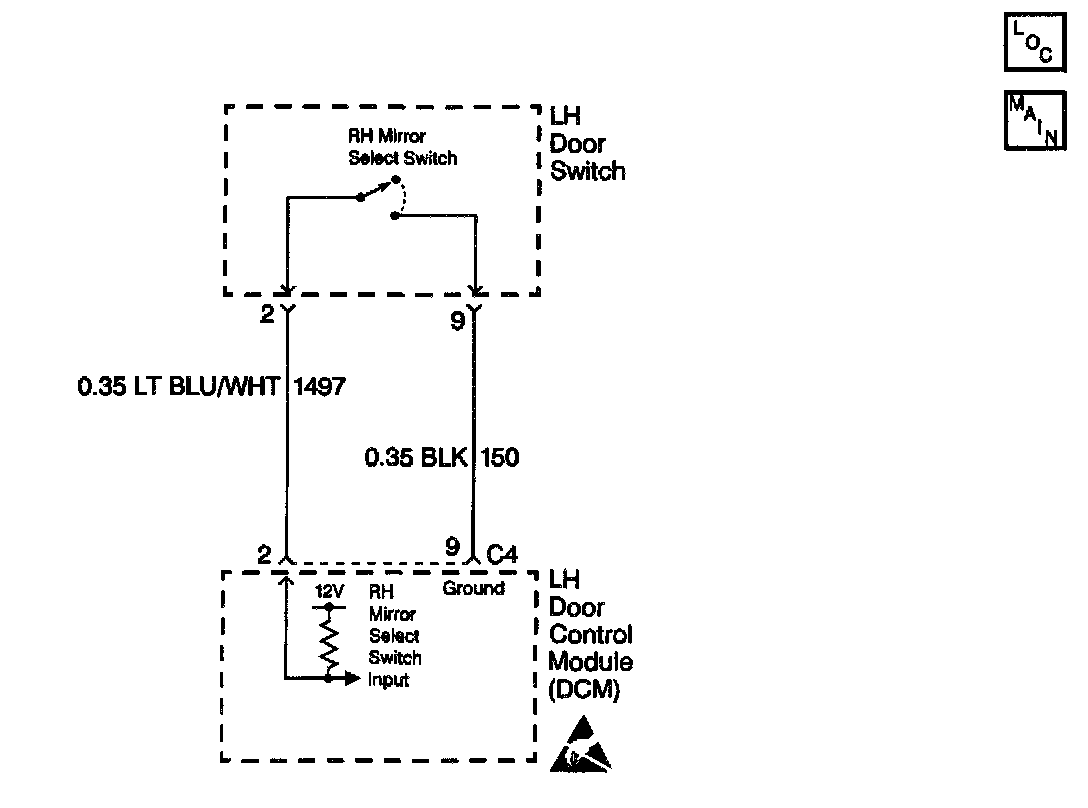 The LH door switch circuit provides input to the LH Door Control Module (LDCM) when the mirror select switch is pressed. This input allows the LDCM to detect a LH or RH mirror request. The LDCM provides both power and ground to both of the mirror select switches. When the LH mirror select switch is pressed, a ground is supplied through the LH mirror select switch to the LH mirror select switch input which is pulled low. When the LDCM detects low voltage on the LH mirror select switch input, the LDCM will allow the LH mirror to operate. When the LDCM detects low voltage on the RH mirror select switch input, the LDCM will allow the RH mirror to operate. The LDCM controls RH mirror functions by sending mirror control messages to the RH Door Control Module (RDCM) on the serial data line. The LDCM monitors both the LH and RH mirror select switch input circuit and determines how long a ground (switch pressed) has been applied. If the ground is applied for longer than expected, a malfunction is present and a DTC will set.