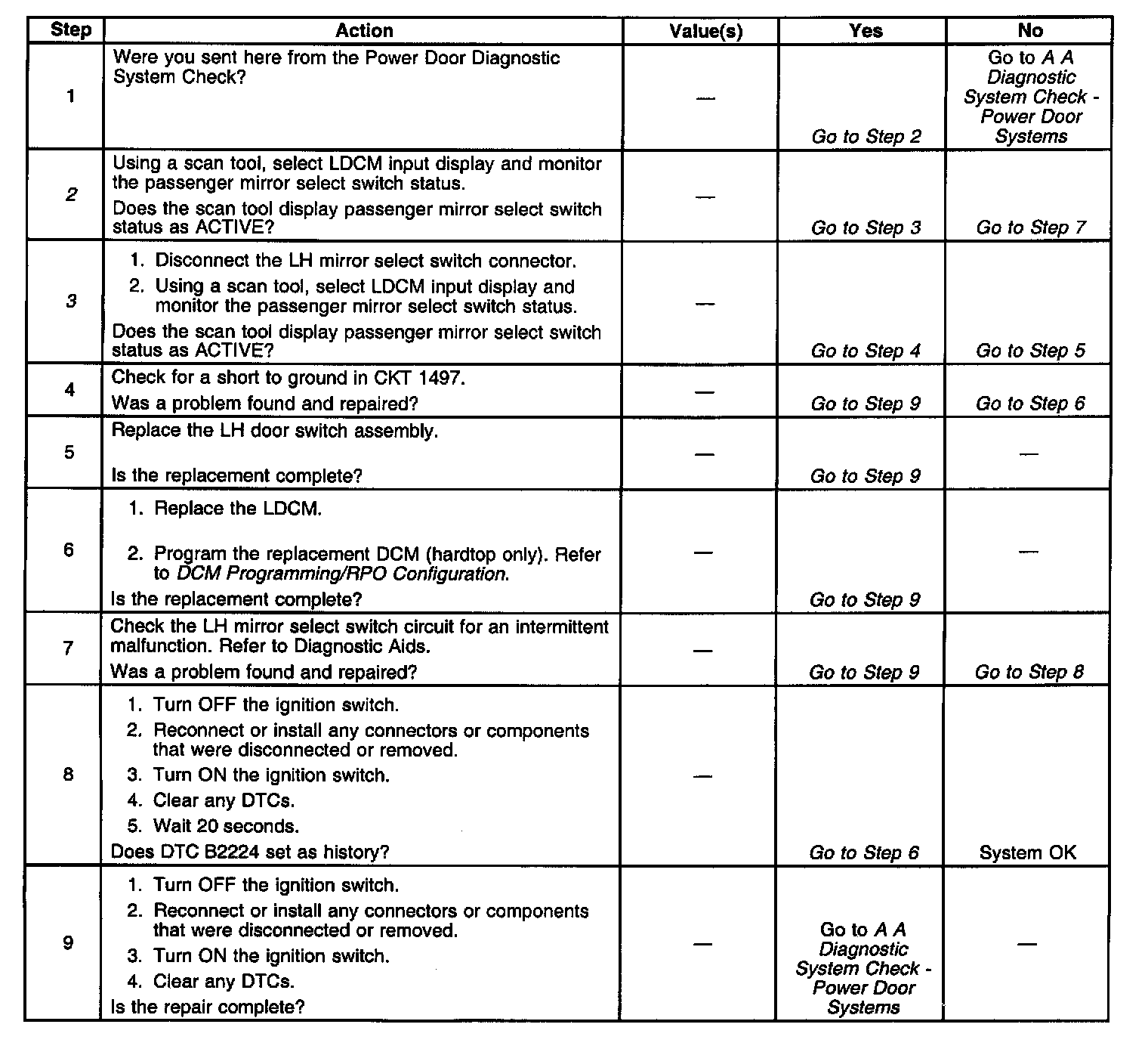 ^ Using a scan tool, select LDCM inputs and monitor the passenger mirror select switch status. If the scan tool displays ACTIVE, disconnect the LH mirror switch and check if the passenger mirror select switch status changes to INACTIVE. If the status changed, then replace the LH mirror switch. It the status did not change, then check CKT 1497 for a short to ground.