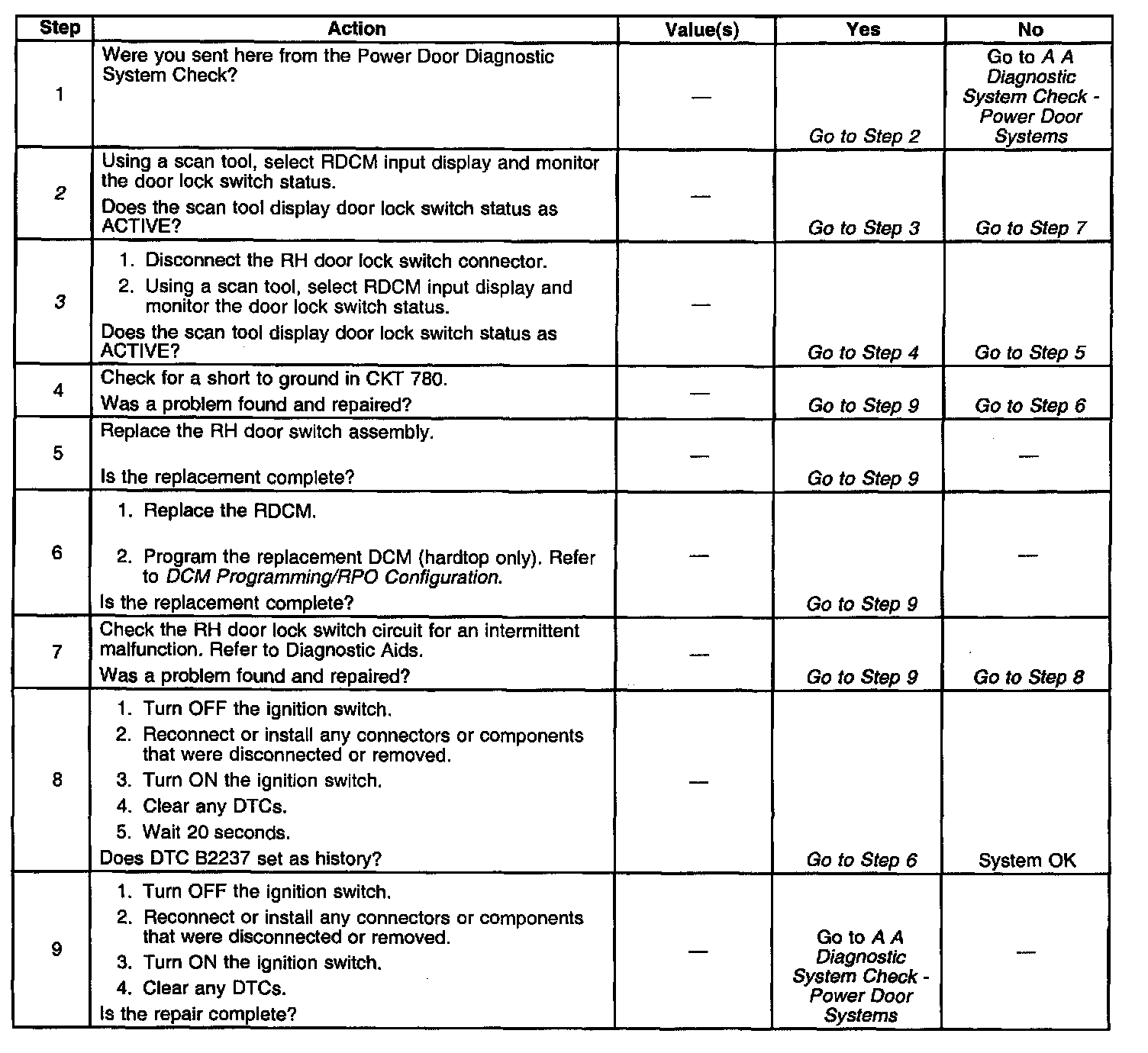 ^ Using a scan tool, select RDCM inputs and monitor the door lock switch status. If the scan tool displays ACTIVE, disconnect the door lock switch and check if the door lock switch status changes to INACTIVE. It the status changed, then replace the door lock switch. If the status did not change, then check CKT 780 for a short to ground.