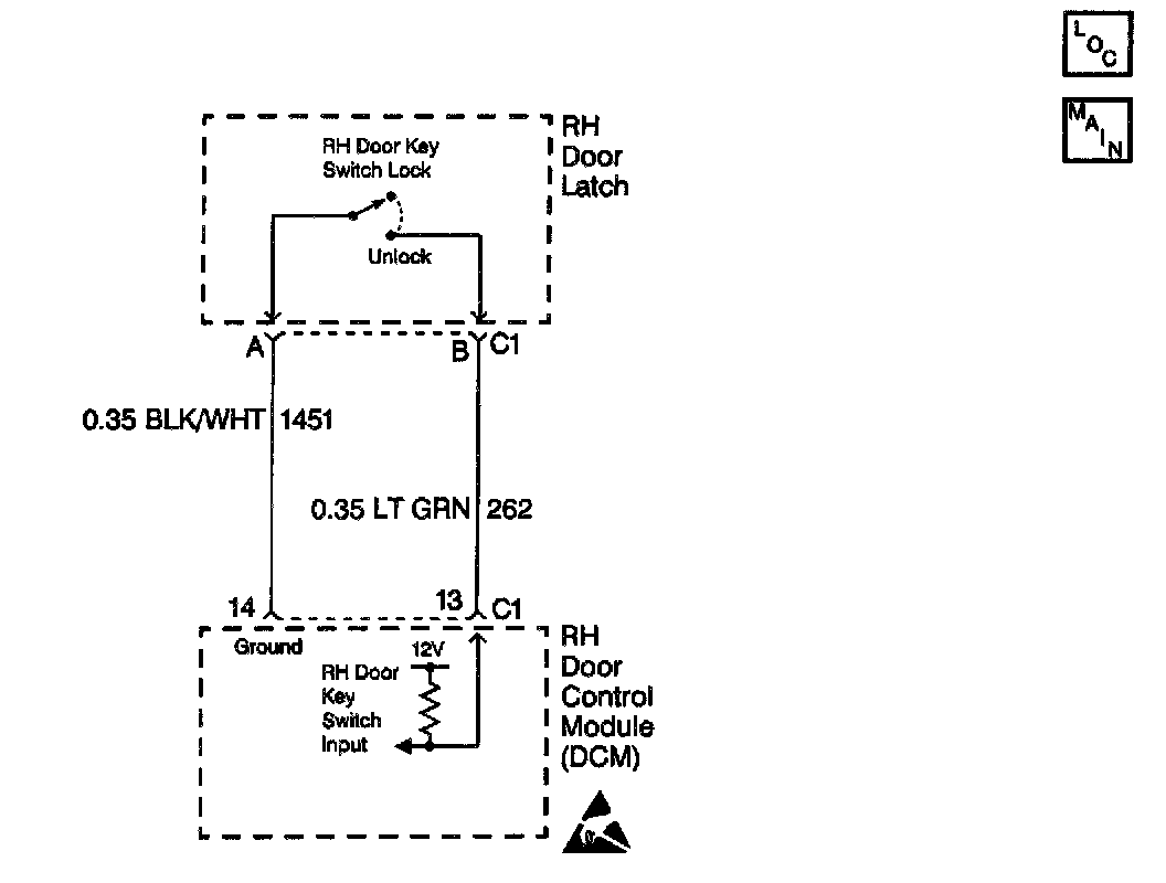 The RH door key switch circuit provides input to the RH Door Control Module (RDCM) when the RH door key switch is rotated the UNLOCK position. This input allows the RDCM to detect when the door is unlocked. This information is sent on the serial data line and used by other systems to execute certain functions (UTD, Illuminated entry, hatch release, etc.). The RDCM provides both power and ground to the RH door key switch. When the RH door key switch is rotated the UNLOCK position, a ground is supplied through the RH door key switch to the RH door key switch input which is pulled low. When the RDCM detects low voltage on the RH door key switch input, the RDCM will UNLOCK the passenger door and will also send a message on the serial data line to the LH Door Control Module (LDCM) to UNLOCK the driver door. The RDCM monitors the RH door key switch input circuit and determines how long a ground (switch activated) has been applied. If the ground is applied for longer than expected, a malfunction is present and a DTC will set.