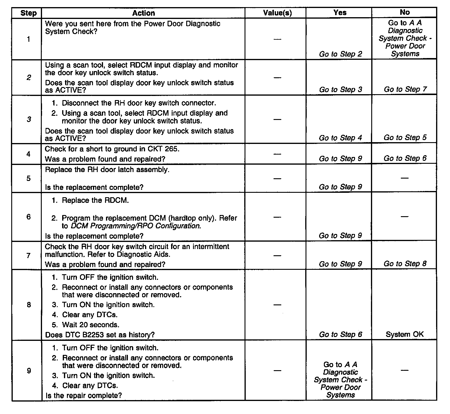 ^ Using a scan tool, select RDCM inputs and monitor the RH door key switch status. If the scan tool displays ACTIVE, disconnect the RH door key switch and check if the RH door key switch status changes to INACTIVE. If the status changed, then replace the RH door key switch. If the status did not change, then check CKT 265 for a short to ground.