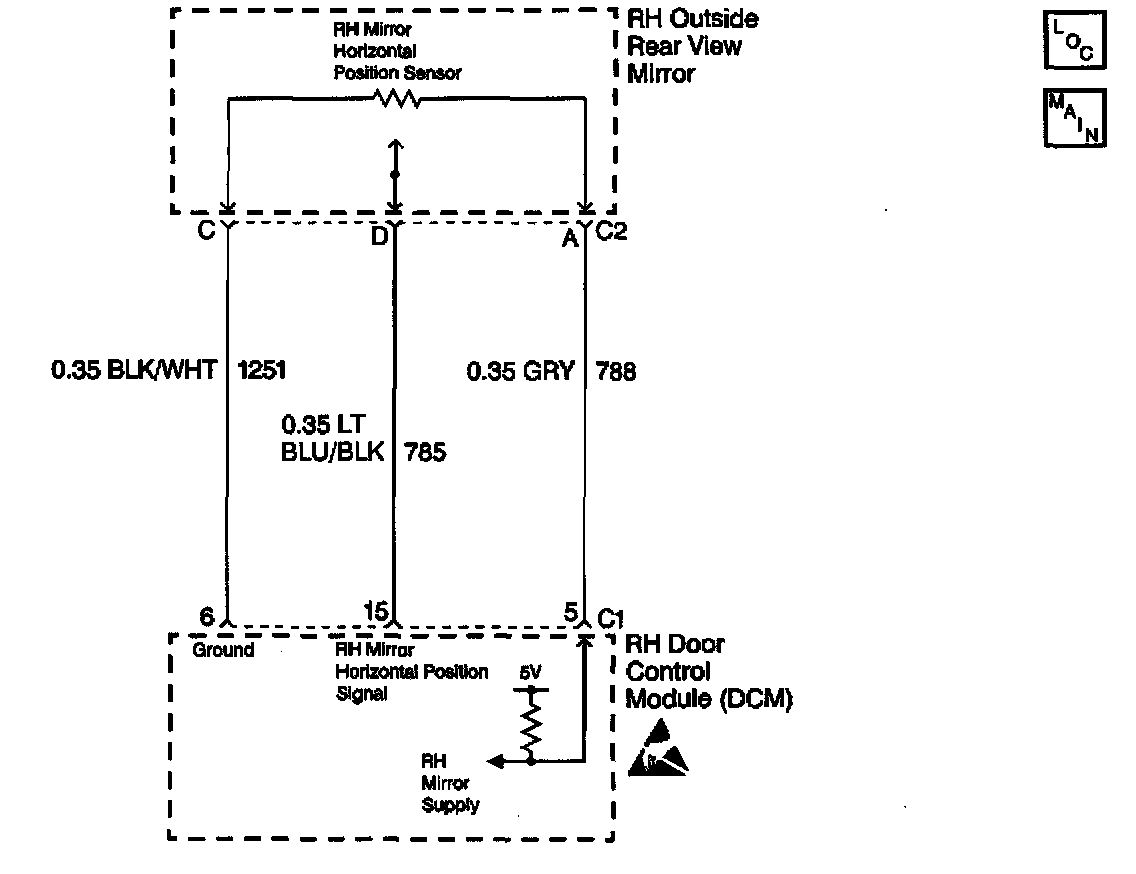 The RH Door Control Module (RDCM) receives a horizontal position signal from the RH mirror horizontal position sensor. This signal is used by the RDCM for memory recall functions to determine the horizontal position of the RH mirror. The RDCM commands the mirror memory settings based upon the voltage level the RDCM receives back from the horizontal position sensor. The RDCM provides a 5 volt supply (CKT 788), a signal (CKT 785) and a ground (CKT 1251) to the horizontal position sensor. The horizontal position sensor is a variable resistor which the RDCM monitors the voltage level across. When the LH Door Control Module (LDCM) sends a memory recall message on the serial data line, the RDCM will command the RH mirror motor in the appropriate direction until the stored position sensor voltage level is achieved. The RDCM also monitors the RH mirror horizontal position signal circuit and can determine if the voltage level received is out of range. If the voltage level is out of range, then a malfunction is present and a DTC will set.