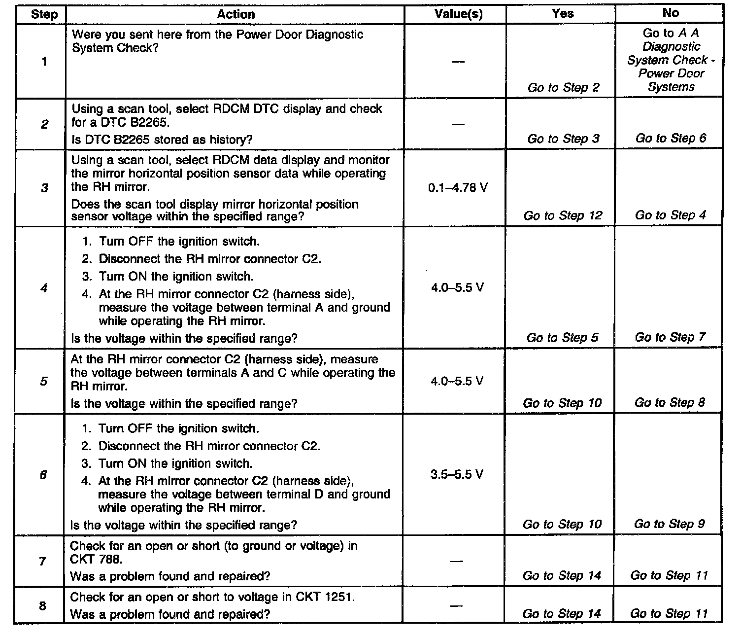 ^ Using a scan tool, select RDCM Data display and monitor the mirror horizontal position data. Move the RH power mirror horizontally in both direction while monitoring the horizontal position sensor data. The voltage range should vary and stay between 0.1-4.78 volts depending on the direction of the mirror. This checks if the mirror horizontal position sensor is open or shorted in different positions.