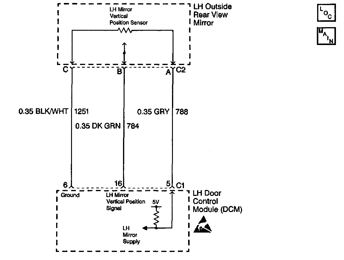 The LH Door Control Module (LDCM) receives a vertical position signal from the LH mirror vertical position sensor. This signal is used by the LDCM for memory recall functions to determine the vertical position of the LH mirror. The LDCM commands the mirror memory settings based upon the voltage level the LDCM receives back from the vertical position sensor. The LDCM provides a 5 volt supply (CKT 788), a signal (CKT 784) and a ground (CKT 1251) to the vertical position sensor. The vertical position sensor is a variable resistor which the LDCM monitors the voltage level across. When a memory setting is recalled, the LDCM will command the LH mirror motor in the appropriate direction until the stored position sensor voltage level is achieved. The LDCM also monitors the LH mirror vertical position signal circuit and can determine if the voltage level received is out of range. If the voltage level is out of range, then a malfunction is present and a DTC will set.