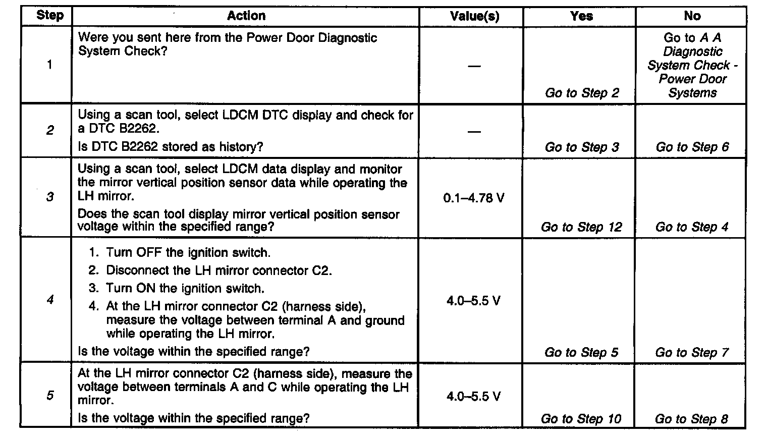 ^ Using a scan tool, select LDCM Data display and monitor the mirror vertical position data. Move the LH power mirror vertically in both direction while monitoring the vertical position sensor data. The voltage range should vary and stay between 0.1-4.78 volts depending on the direction of the mirror. This checks if the mirror vertical position sensor is open or shorted in different positions.