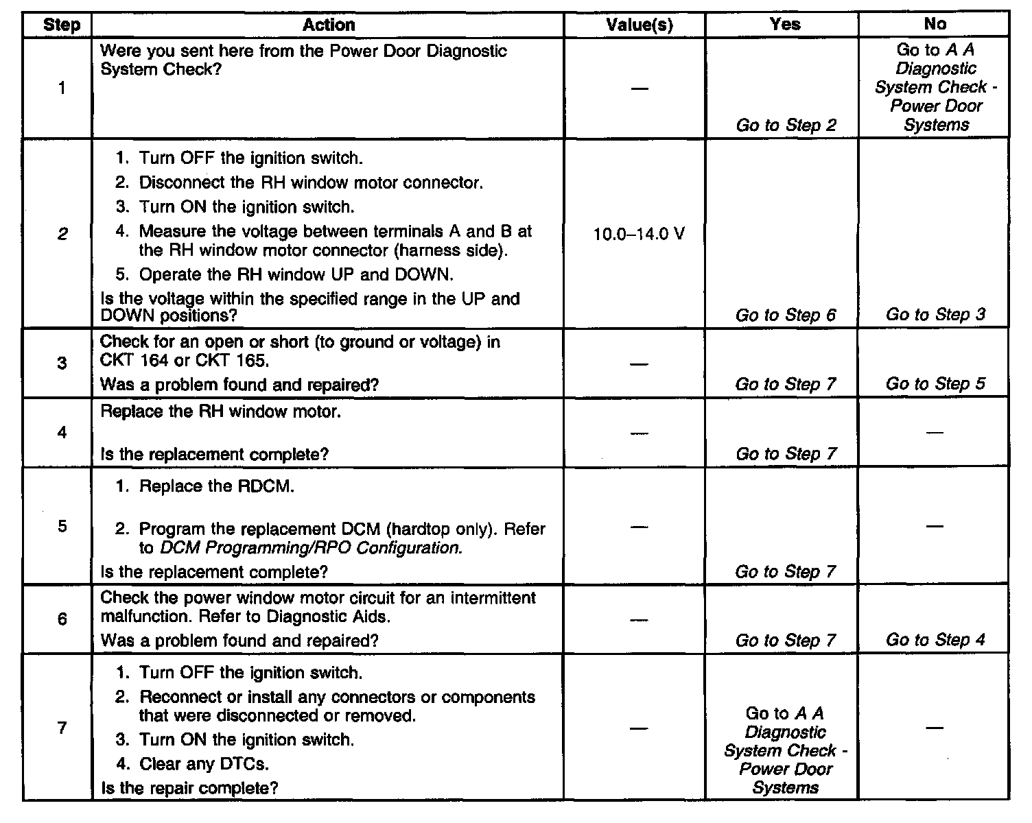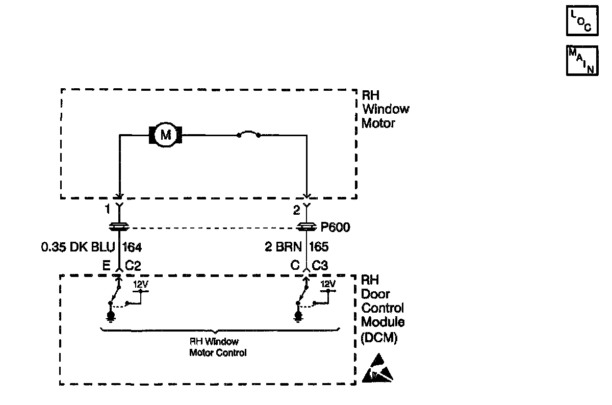 The RH Door Control Module (RDCM) provides the RH window motor control output functions. This output control allows the RDCM to command the RH power window UP or DOWN. The RH door switch circuit provides an input to the RDCM when the window switch is pressed UP or DOWN. When the RDCM detects an active window command from either the RH window switch or a window command message on the serial data line from the LH Door Control Module (LDCM), the RDCM will command the RH window motor in the appropriate direction. The RDCM accomplishes this by applying a ground or voltage to CKT 164 and CKT 165 depending on the desired window direction. The RDCM monitors the amount of current draw on the RH window motor circuit. If the current draw is not within the acceptable range, a malfunction is present and a DTC will set.