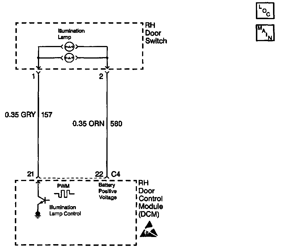 The RH Door Control Module (RDCM) provides an illuminated LED output control for the RH door switch assembly. This output control allows the RDCM to illuminated switch assembly when the park lamps and/or headlamps are ON. The RDCM provides power and a Pulse-Width Modulation (PWM) ground output to the RH door switch. When the RDCM receives a message on the serial data line indicating that the park lamps or headlamps are ON, the RDCM will control the RH switch illumination by PWM-ing the ground. The RDCM monitors the amount of current draw on the illumination lamp control circuit. It the current draw is not within the acceptable range, a malfunction is present and a DTC will set.