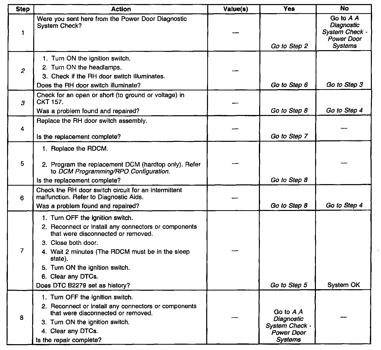 2. This test checks if the RH door switch illuminates. The RDCM will disable the RH door switch illumination lamps if the RDCM detects a malfunction.