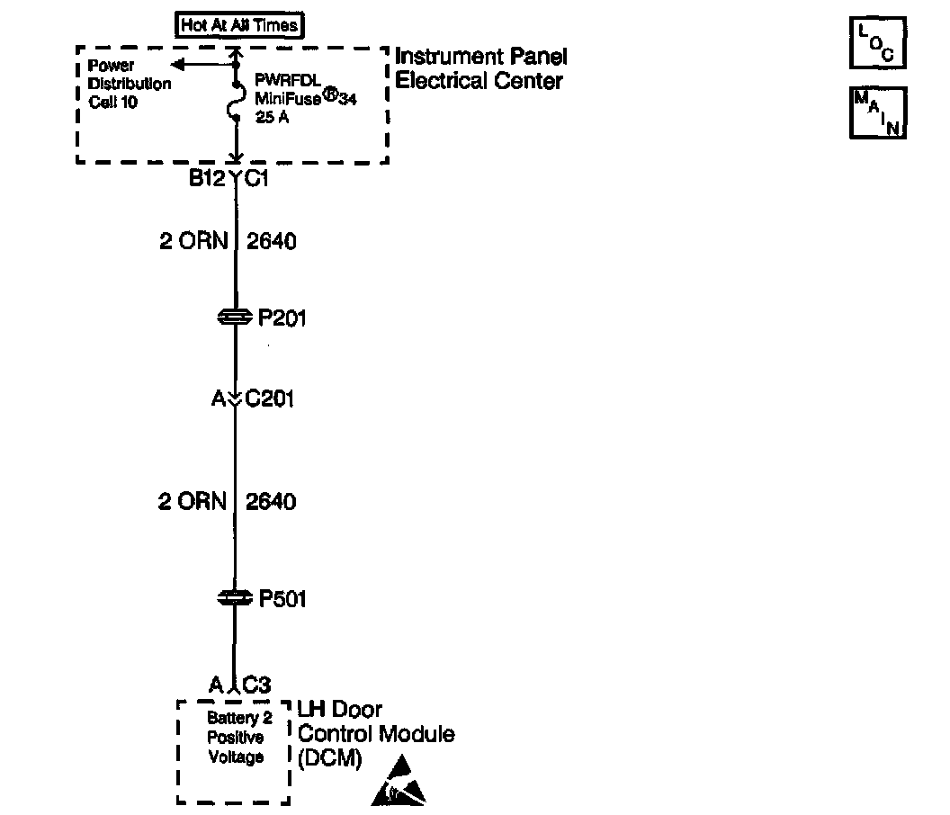 The LH Door Control Module (LDCM) has two main power feeds (high and low), and one main ground. The low power feed (battery 1) is used to provide power for the LDCM logic and internal driver operation. The high power feed (battery 2) is used to provide power for Systems that draw higher amounts of current (motors, lights etc.). For most functions, the LDCM will operate properly when vehicle system voltage is between 9.0-16.0 volts. The LDCM also monitors the voltage level at battery 1 and battery 2 circuits and can determine if the voltage level received is out of range. If the voltage level is out of range in either circuit, then a malfunction is present and a DTC will set.