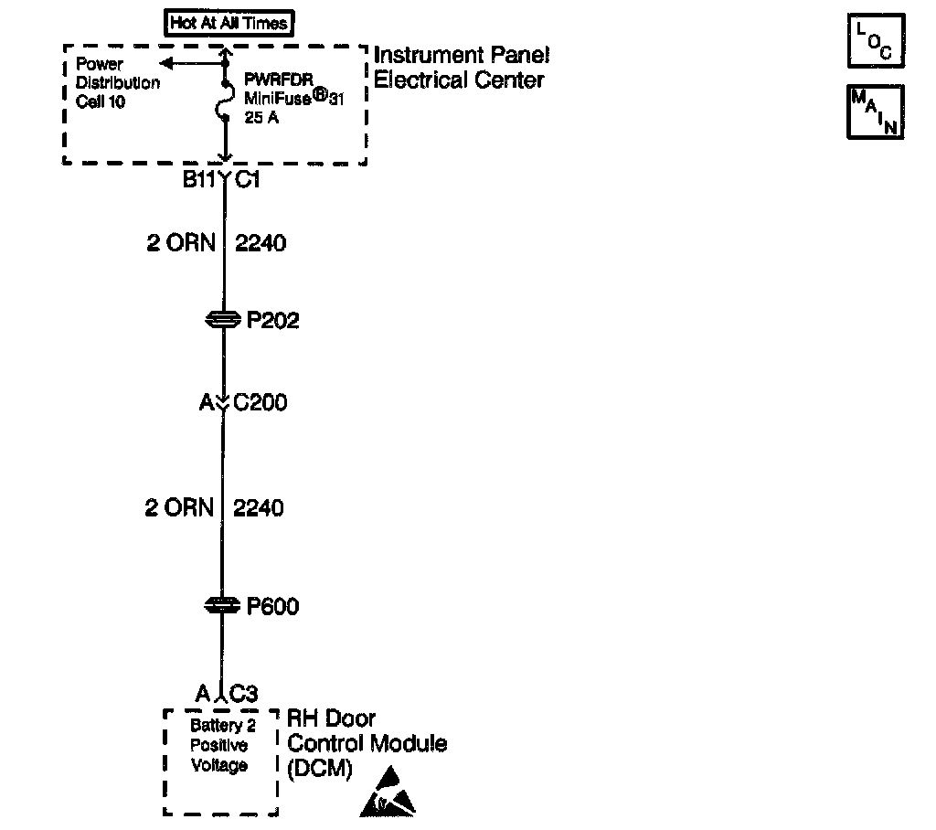 The RH Door Control Module (RDCM) has two main power feeds (high and low), and one main ground. The low power feed (battery 1) is used to provide power for the RDCM logic and internal driver operation. The high power feed (battery 2) is used to provide power for systems that draw higher amounts of current (motors, lights etc.). For most functions, the RDCM will operate properly when vehicle system voltage is between 9.0-16.0 volts. The RDCM also monitors the voltage level at battery 1 and battery 2 circuits and can determine if the voltage level received is out of range. If the voltage level is out of range in either circuit, then a malfunction is present and a DTC will set.
