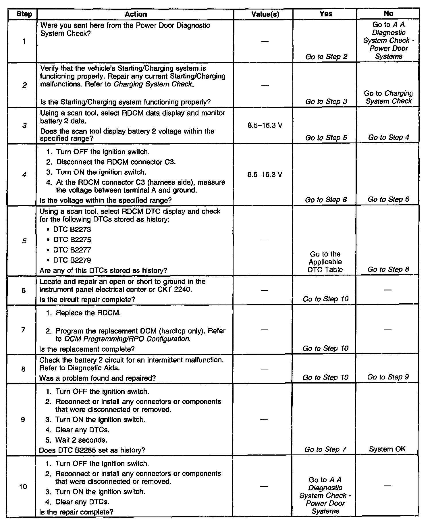 2. This test checks if the vehicle's Starting/Charging system is functioning properly. Starting/Charging system malfunctions will cause the RDCM to store a history DTC B2285, therefore always repair all Starting/Charging malfunctions first.