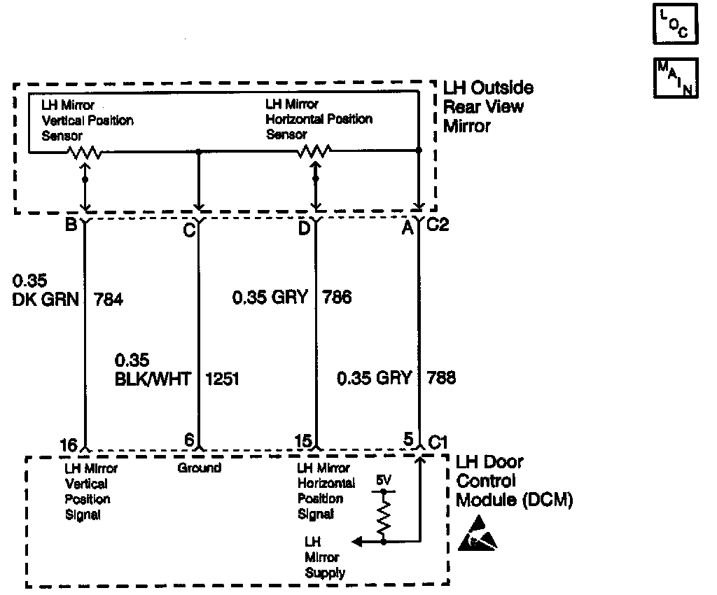 The LH Door Control Module (LDCM) receives both vertical and horizontal position signals from the LH mirror. These signals are used by the LDCM for memory recall functions to determine the vertical and horizontal position of the LH mirror. The LDCM commands the mirror memory settings based upon the voltage level the LDCM receives back from the vertical and horizontal position sensors. The LDCM provides a 5 volt supply, a signal, and a ground to both of the position sensors. The position sensors are variable resistors which the LDCM monitors the voltage level across. When a memory setting is recalled, the LDCM will command the LH mirror motor in the appropriate direction until both the vertical and horizontal position sensors are within the voltage range stored in memory. The LDCM also monitors the LH mirror vertical and horizontal position sensor 5 volt supply circuit and can determine if the voltage level received is out of range. If the voltage level is out of range, then a malfunction is present and a DTC will set.