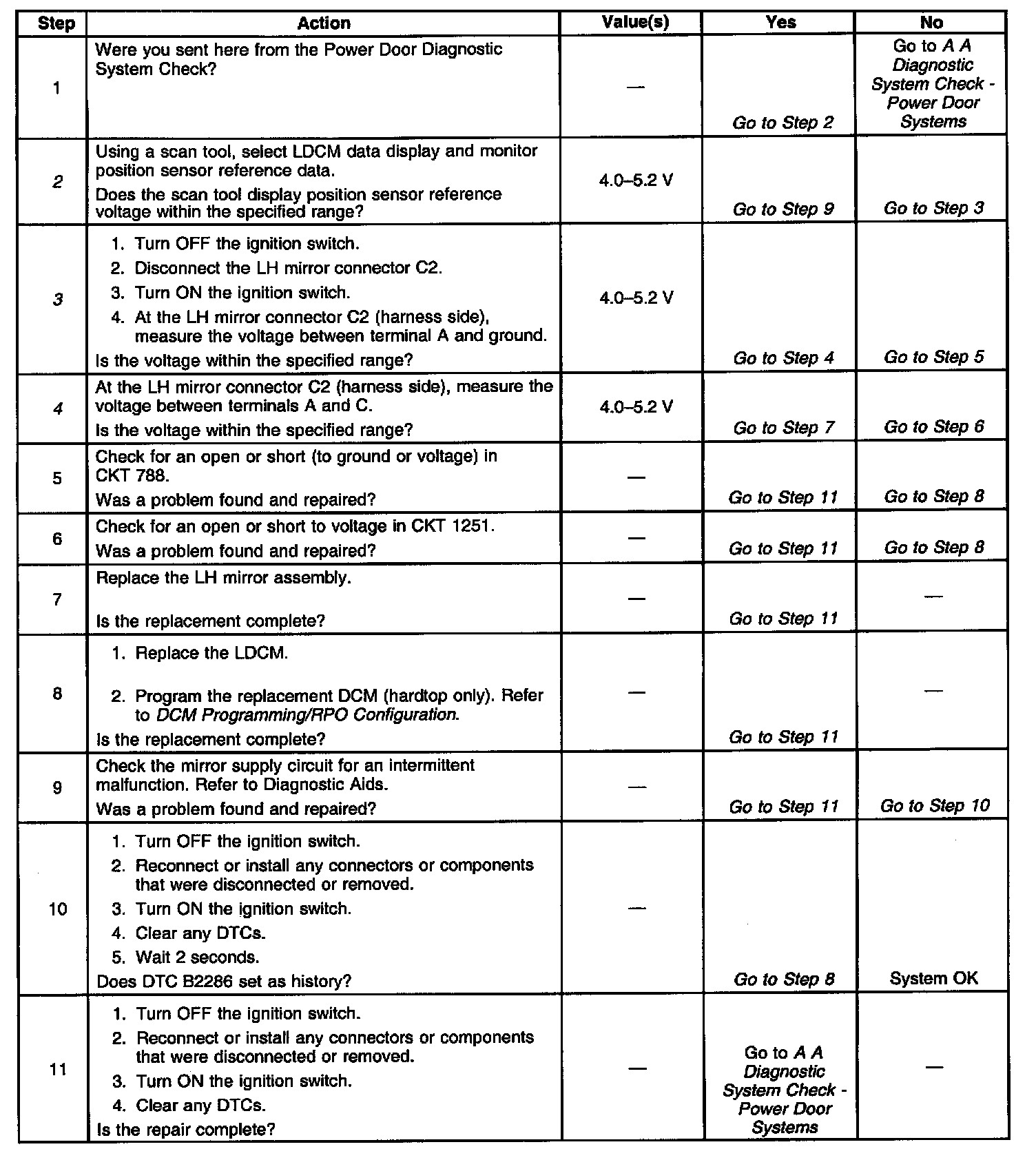2. This test checks the position sensor reference voltage using a scan tool. Normal mirror position sensor reference voltage range is between 4.0-5.2 volts.