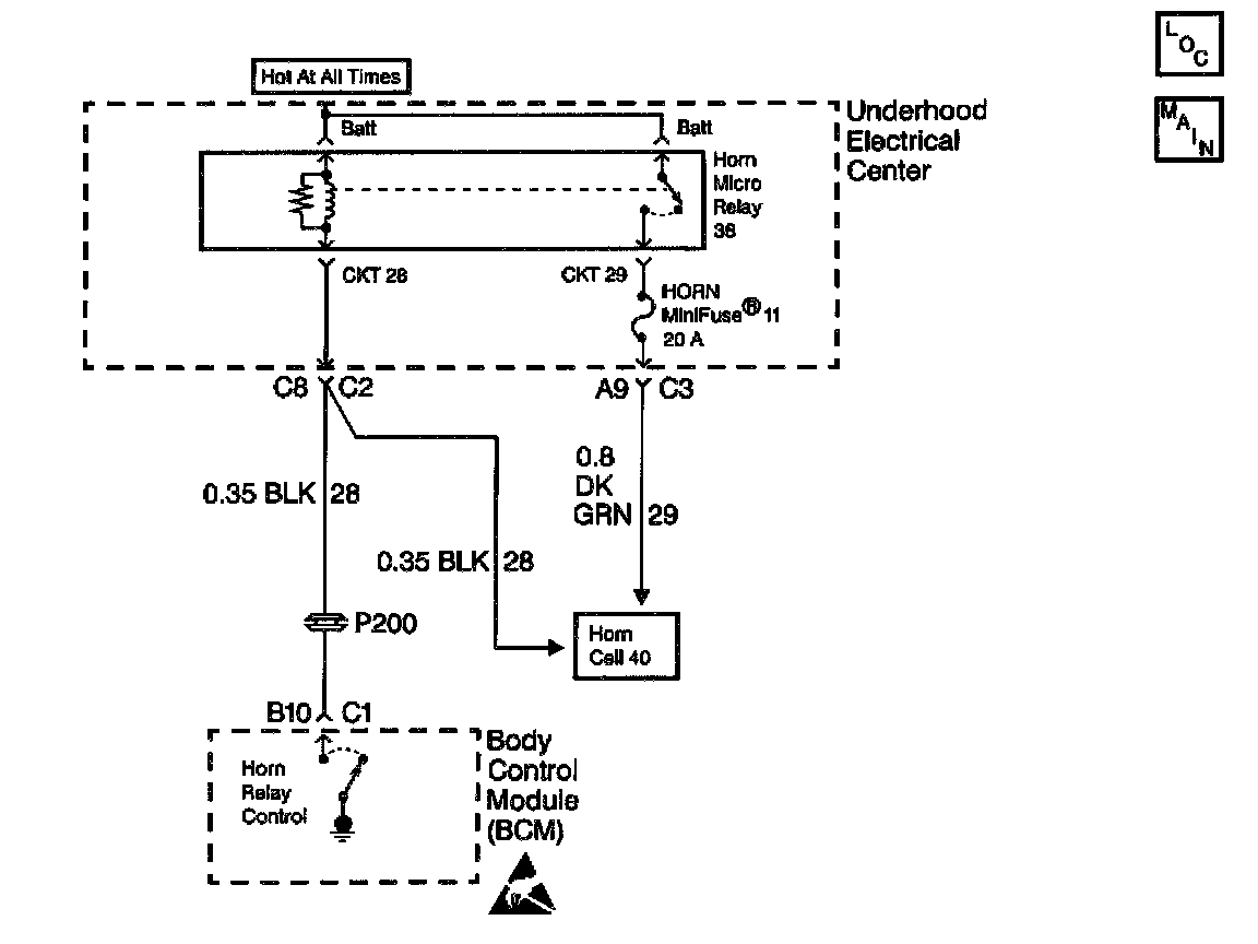 ^ The BCM no longer detects a high voltage level in CKT 28 only with the horn relay de-energized.