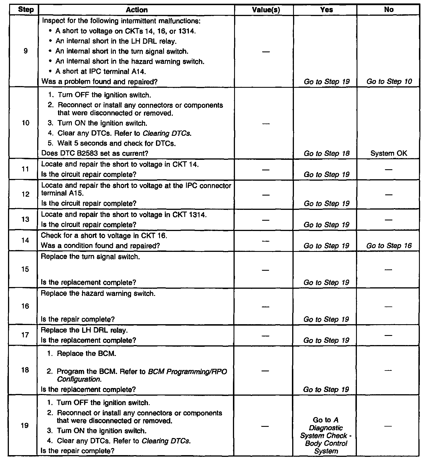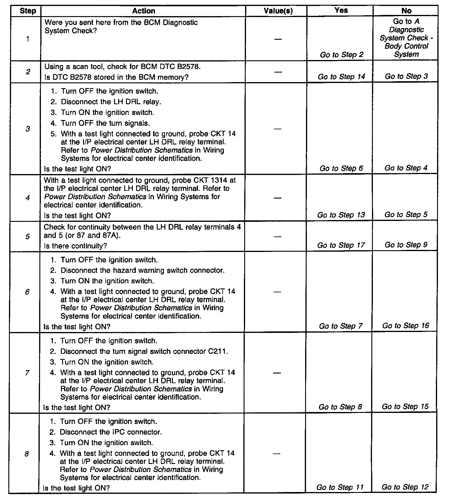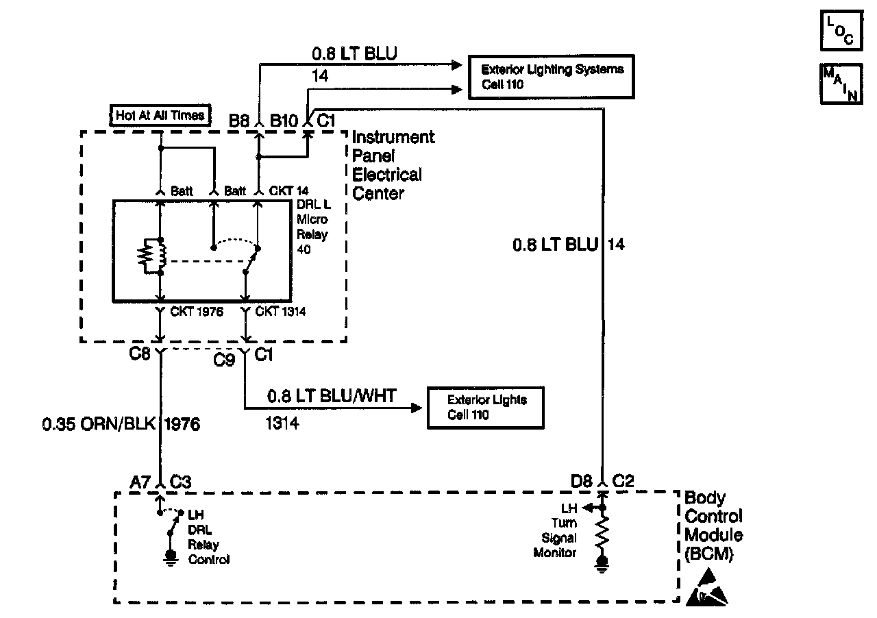 ^ The BCM needs to detect voltage oscillations on CKT 14 in order to de-energize the LF DRL relay. If the BCM detects continuous voltage on CKT 14, the BCM interprets this as a short to voltage. The BCM will continue with normal DRL operation, and the LF turn signal will remain inoperative.