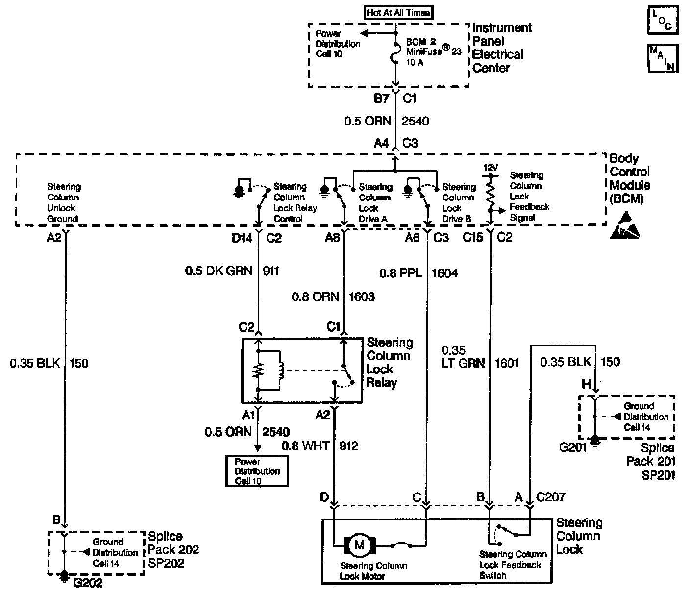 The BCM provides the steering column control function which allows the column to be electronically locked or unlocked. The BCM provides two outputs, column lock drive (A) and column unlock drive (B) and a steering column lock relay control output. The BCM can apply a ground or battery output on the column lock drive (A) CKT 1603 or column unlock drive (B) CKT 1604 depending on the desired steering column lock motor position. The BCM uses the feedback switch in order to monitor the motor position and determine if the commanded position was accomplished.
