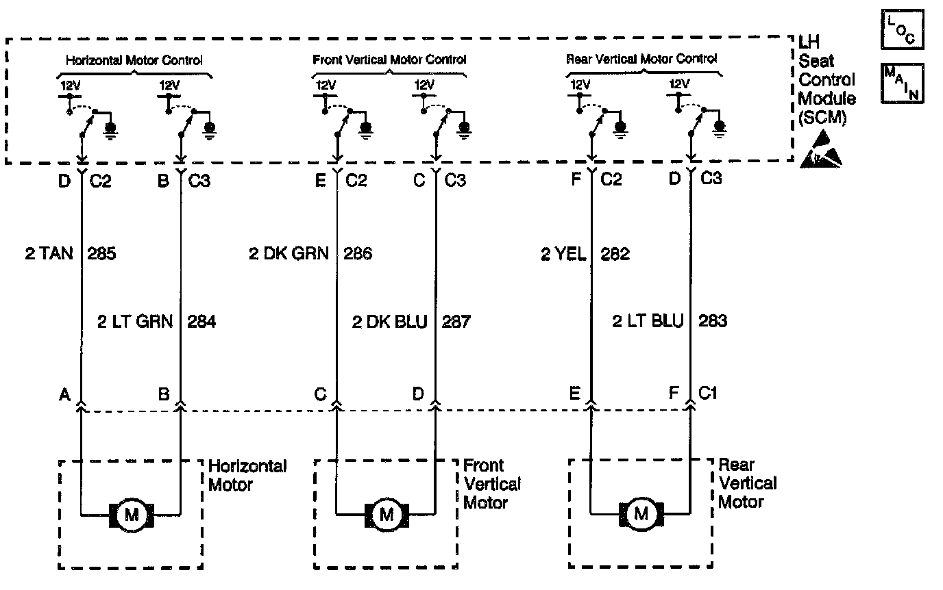 The LH Seat Control Module (SCM) controls the output functions of the LH seat motors after it receives a valid seat switch input. The LH seat switch provides the input to the SCM whenever a request is made. The SCM will provide either voltage or ground to the relative seat motor circuit depending on the desired seat position. The SCM monitors the seat motor control circuits for the possibility of a short to battery voltage. If at anytime the SCM senses voltage on CKT's 282, 283, 284, 285, 286 or 287 when a seat request has not been made, the SCM will disable the seat motor and set a DTC.
