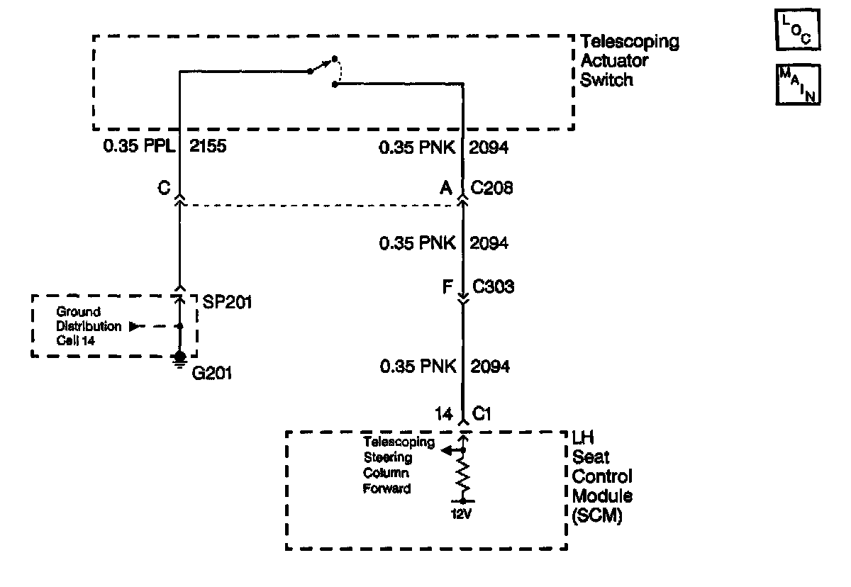 The telescoping steering column switch circuit provides an input to the LH Seat Control Module (SCM) when the switch is held closed in the in or out position. The SCM monitors a 12 volt signal applied to the steering column switch circuit (2094). When the steering column switch is closed in the in position, the column in 12 volt signal is grounded and pulled low within the SCM, indicating a column in request.