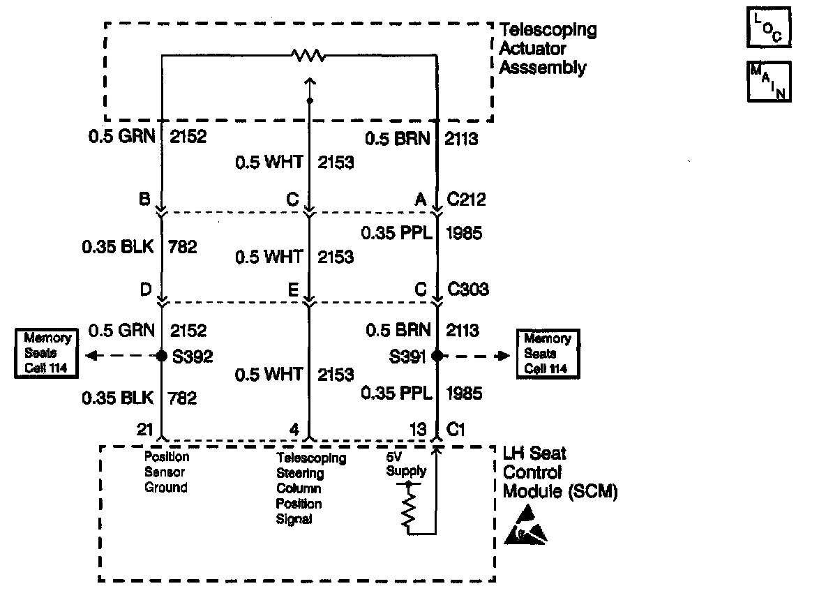 The memory seat and telescoping steering column position settings are stored in the LH Seat Control Module (SCM). The SCM measures and stores the steering column position by using a position sensor, which is an internal part of the telescoping actuator. The SCM provides the position sensor with a 5 volt power supply (circuit 2113), and ground (circuit 2152). The SCM monitors the position sensor signal voltage (circuit 2153), which ranges from 0.1-4.78 volts depending on the steering column position. The steering column position sensor becomes active only when the SCM detects a steering column in/out switch input.