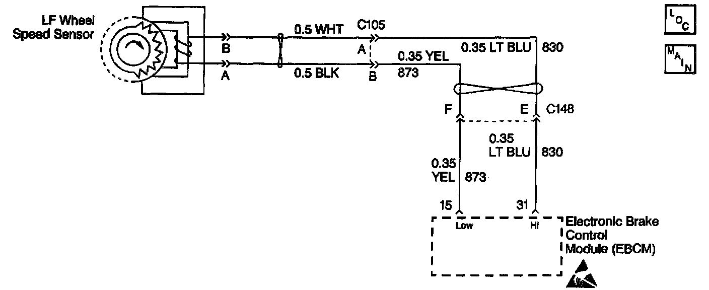 The speed sensor used on this vehicle is a single point magnetic pickup. This sensor produces an AC signal that the Electronic Brake and Traction Control Module (EBTCM) uses the frequency from to calculate the wheel speed.
