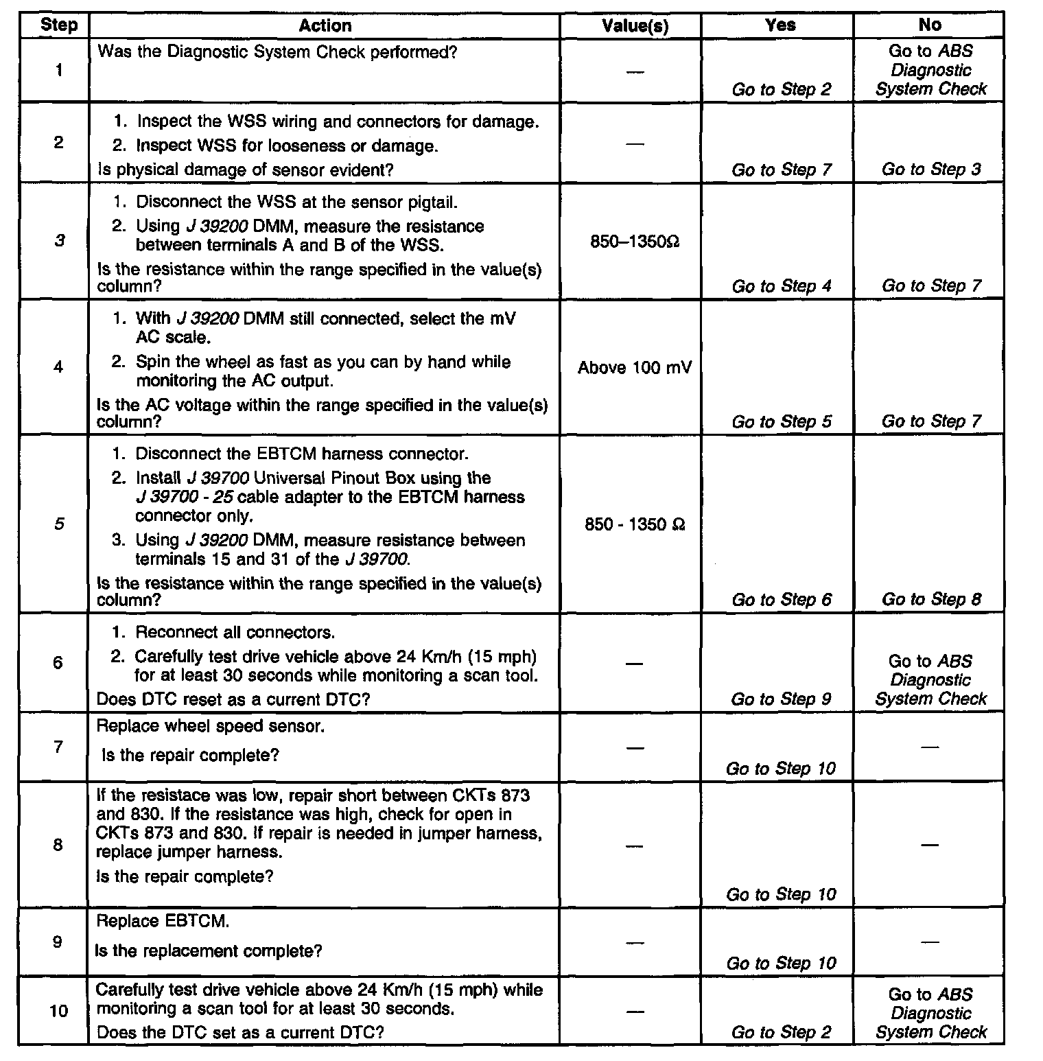 The Diagnostic Trouble Code (DTC) will set if one wheel speed = 0 and the other Wheel Speed Sensor (WSS) are greater than 8 Km/h (5 mph) for 2.5 seconds.