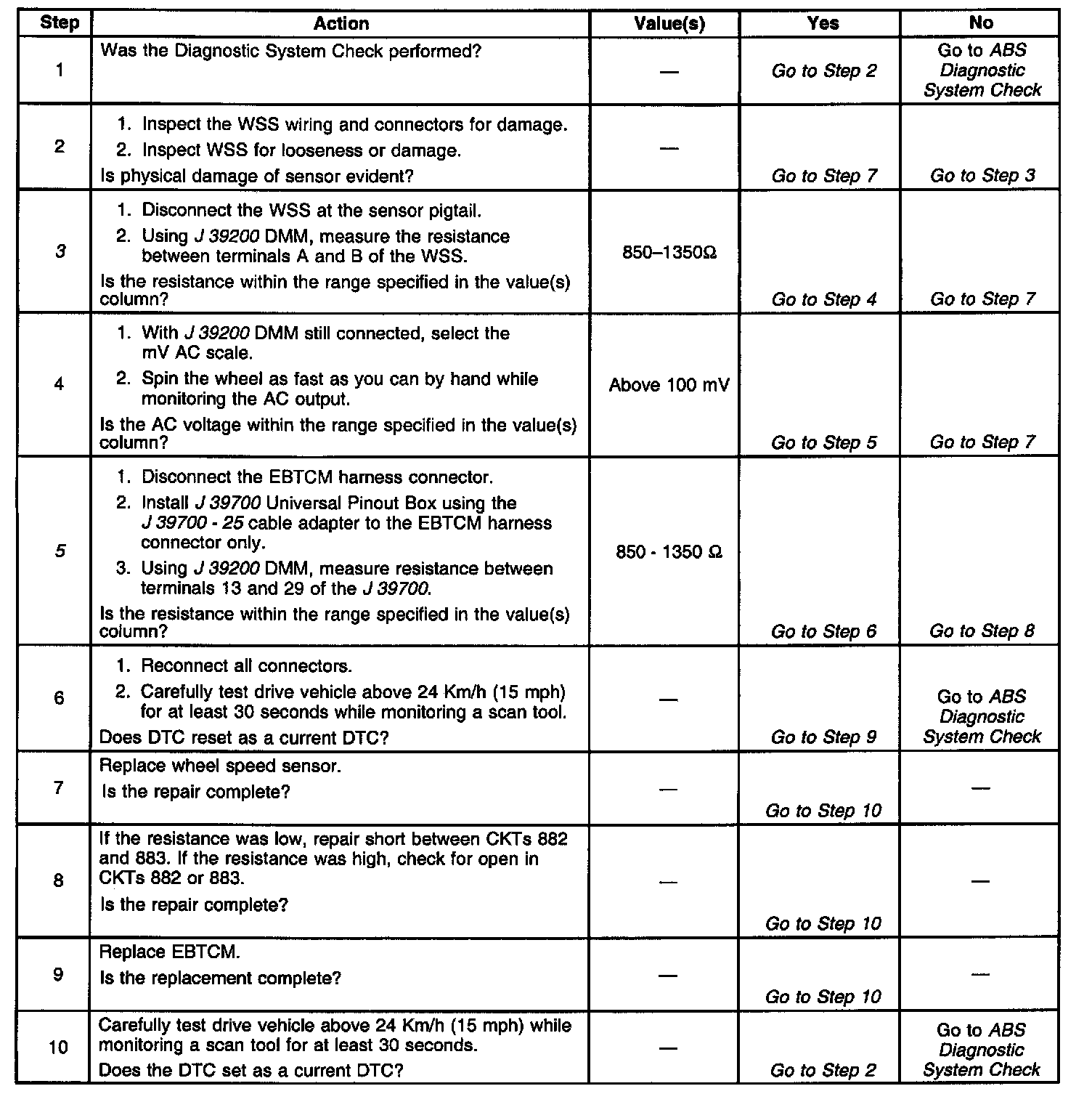 The Diagnostic Trouble Code (DTC) will set if one wheel speed = 0 and the other Wheel Speed Sensor (WSS) are greater than 8 Km/h (5 mph) for 2.5 seconds.