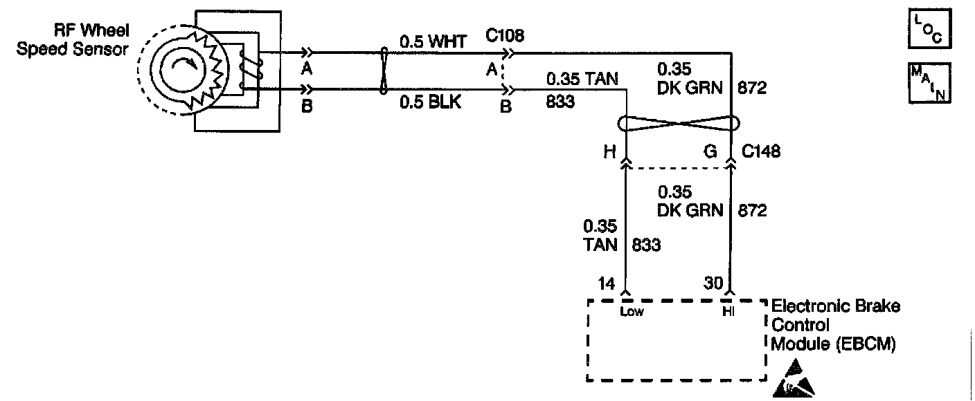 The speed sensor used on this vehicle is a single point magnetic pickup. This sensor produces an AC signal that the Electronic Brake and Traction Control Module (EBTCM) uses the frequency from to calculate the wheel speed.