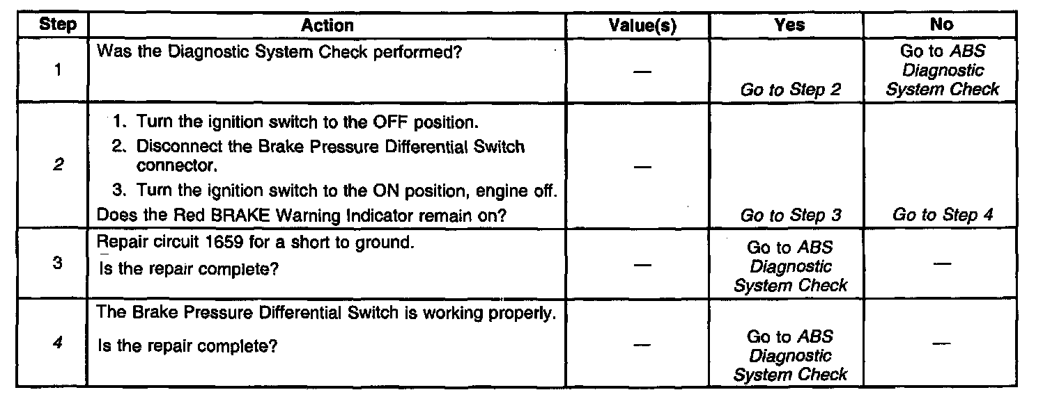 4. This step indicates that the Brake Pressure Differential Switch circuit is operating properly, and the cause of the Diagnostic Trouble Code (DTC) is a failure in the hydraulic brake system.