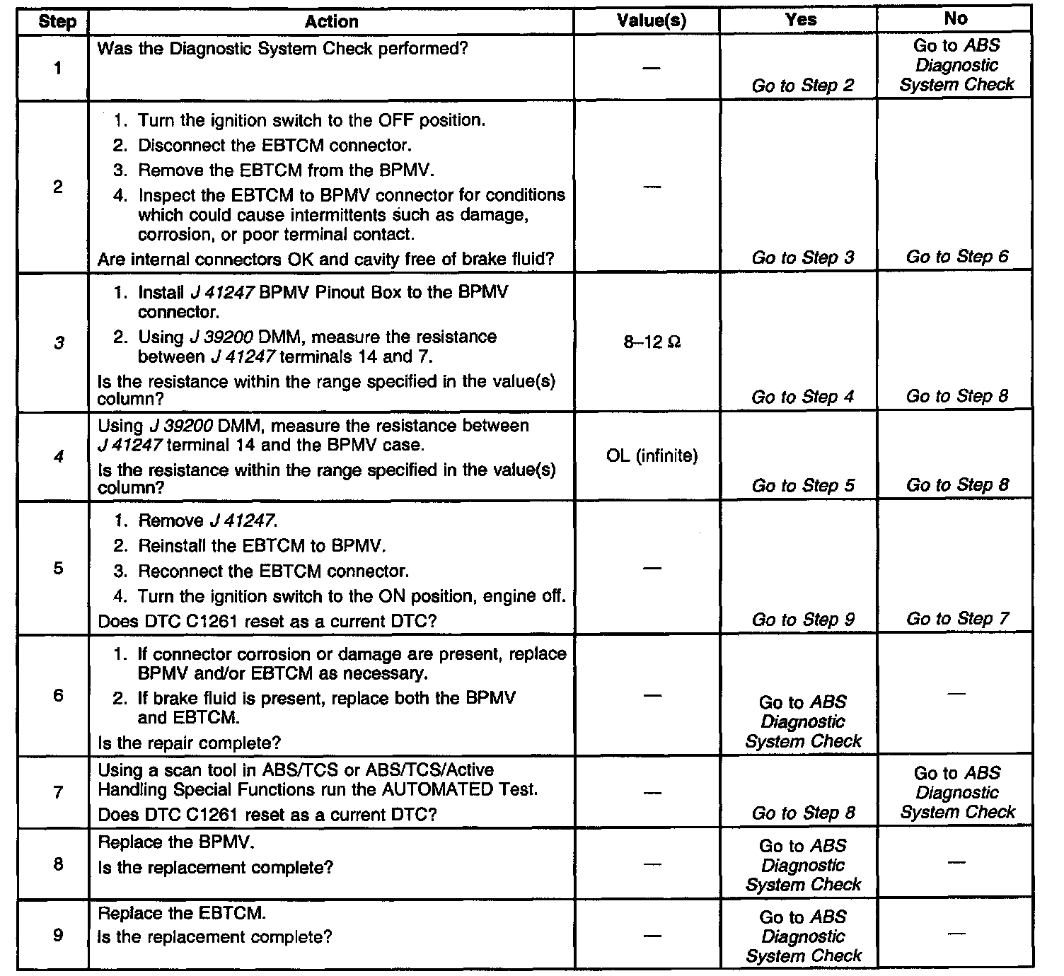 ^ Diagnostic Trouble Code (DTC) C1256xx can be set when there is a solenoid short to battery inside the Brake Pressure Modulator Valve (BPMV). If DTCs C1261 - C1274 are set along with C1256xx then pursue the solenoid DTCs first.