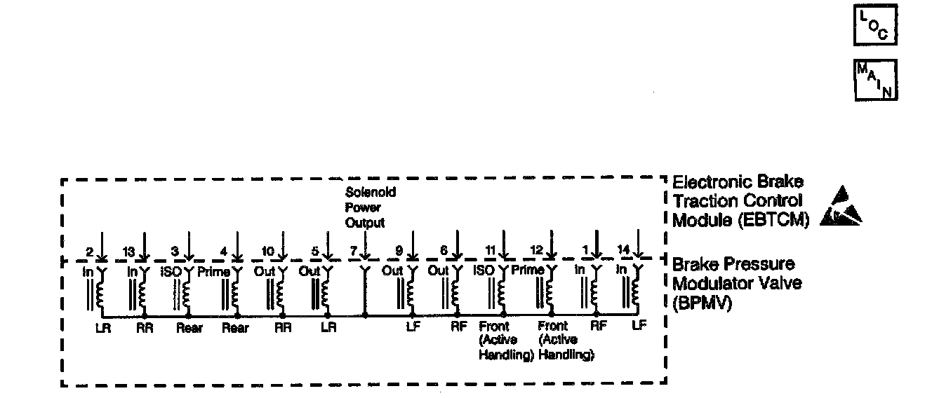 The Inlet valve solenoid circuits are supplied with battery power when the ignition is in the ON position. The Electronic Brake and Traction Control Module (EBTCM) controls the valve functions by grounding the circuit when necessary.