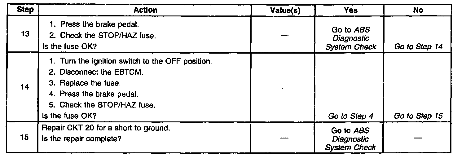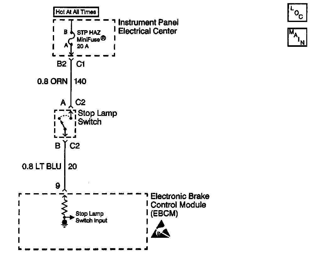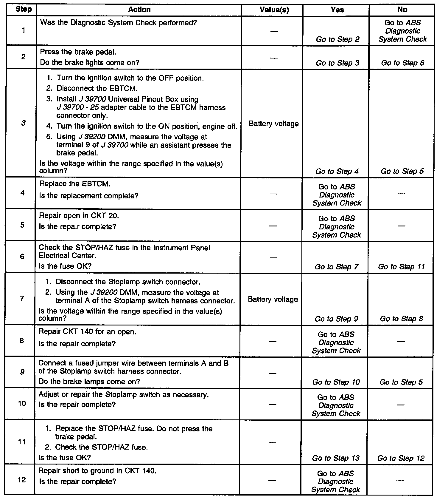 This Diagnostic Trouble Code (DTC) is used to identify open Stoplamp switch circuitry that prevents the Stoplamp switch input to the Electronic Brake and Traction Control Module (EBTCM) from changing states when the brake is applied.